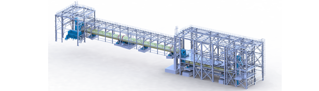 Работа комплекса термической обработки начинается с подачи исходной руды в бункер питателя самосвалом или погрузчиком, после чего руда поступает в загрузочную камеру печи и продвигается вперед. Внутри печи происходит сушка и последующий обжиг сырья. Обожженный материал просыпается из печи и поступает в холодильник, после охлаждения руда с температурой 50-60 градусов транспортером отгружается для дальнейшей переработки.