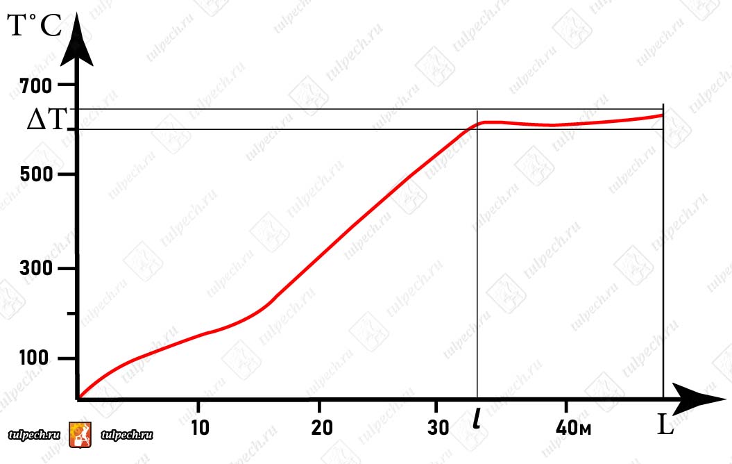 Основной особенностью термической обработки руды является очень точное соблюдение режимов обжига. В случае превышения температуры или времени обжига сырье может стекловаться и получить золото уже будет невозможно, а в случае незначительных недоборов по времени или температуре отвлекаемость ценного продукта кратно падает и может составлять 30-40%. В случае применения нашей технологии извлекаемость золота достигает 95 % и выше. Это удается благодаря применению особого распределения движения теплоносителя внутри печи, что и обеспечивает необходимый температурный режим по длине печи, представленный на рисунке ниже.