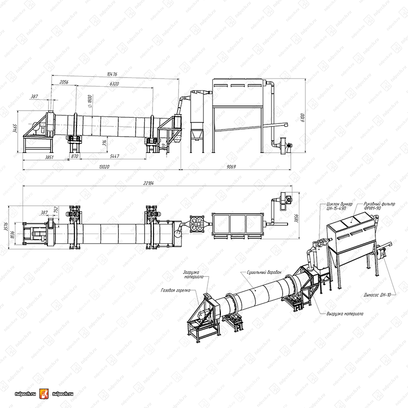Барабанная установка обеспечивает обезвоживание самых различных фракций щебня. В зависимости от типа породы и физико-химических свойств щебня может требоваться определенная конструкция барабанной сушилки. В любом случае такой барабан имеет: