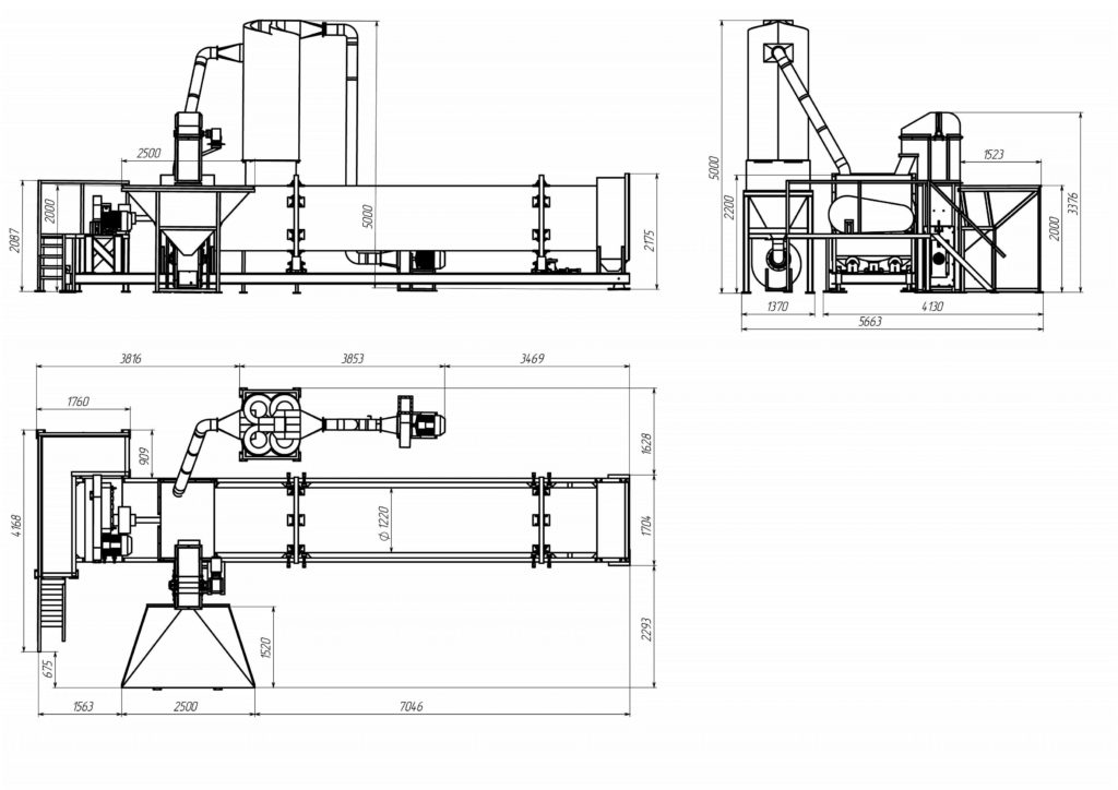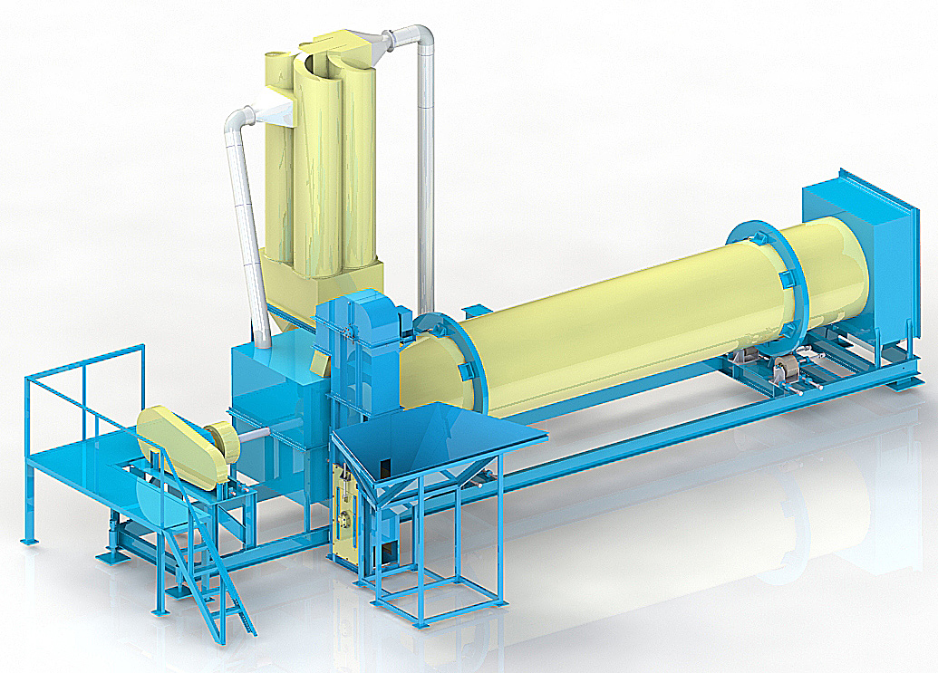 Барабан представляет собой агрегат на опорах вращательного типа, с устройствами для погрузки продукта и его выгрузки (расположены с разных сторон корпуса), установкой циклонного типа, газоходом (с дымососом или без него), а также системой управления и контроля. Последняя в зависимости от модели машины может быть полностью автоматической.