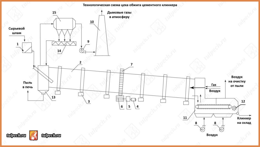 1. Шламовый питатель; 2. — Вращающаяся печь для обжига клинкера; 3. – Опорные ролики; 4. – Электродвигатель печи клинкера; 5. – Редуктор; 6. – Подвенцовая шестерня; 7. – Венцовая шестерня; 8. – Нагнетающие вентиляторы; 9. – Вентилятор дымососа; 10. – Труба дымососа; 11. – Холодильник; 12. – Молотковая дробилка; 13 – Пылеосадительная камера; 14. — Шнековый транспортер, 15. — Фильтр