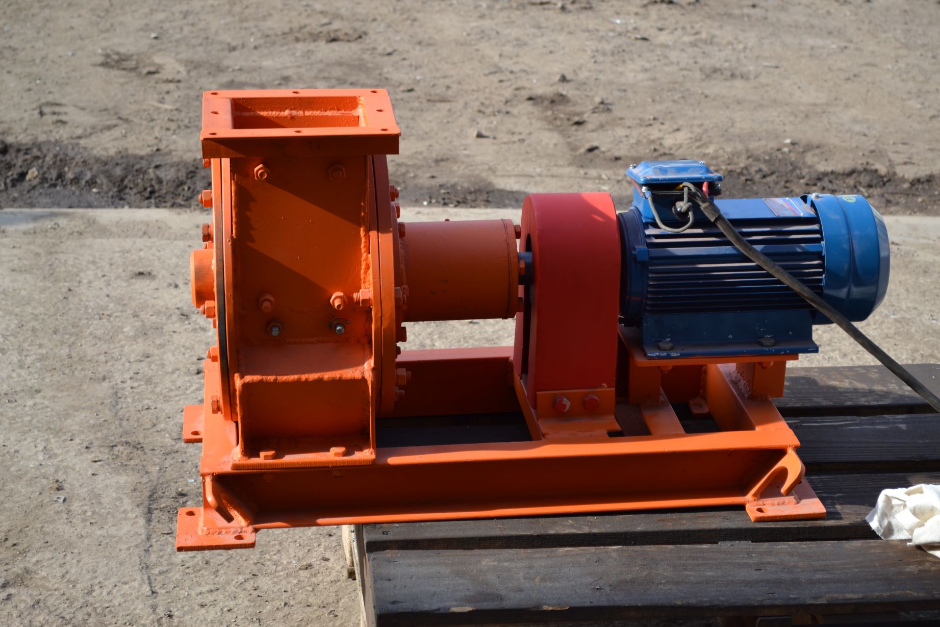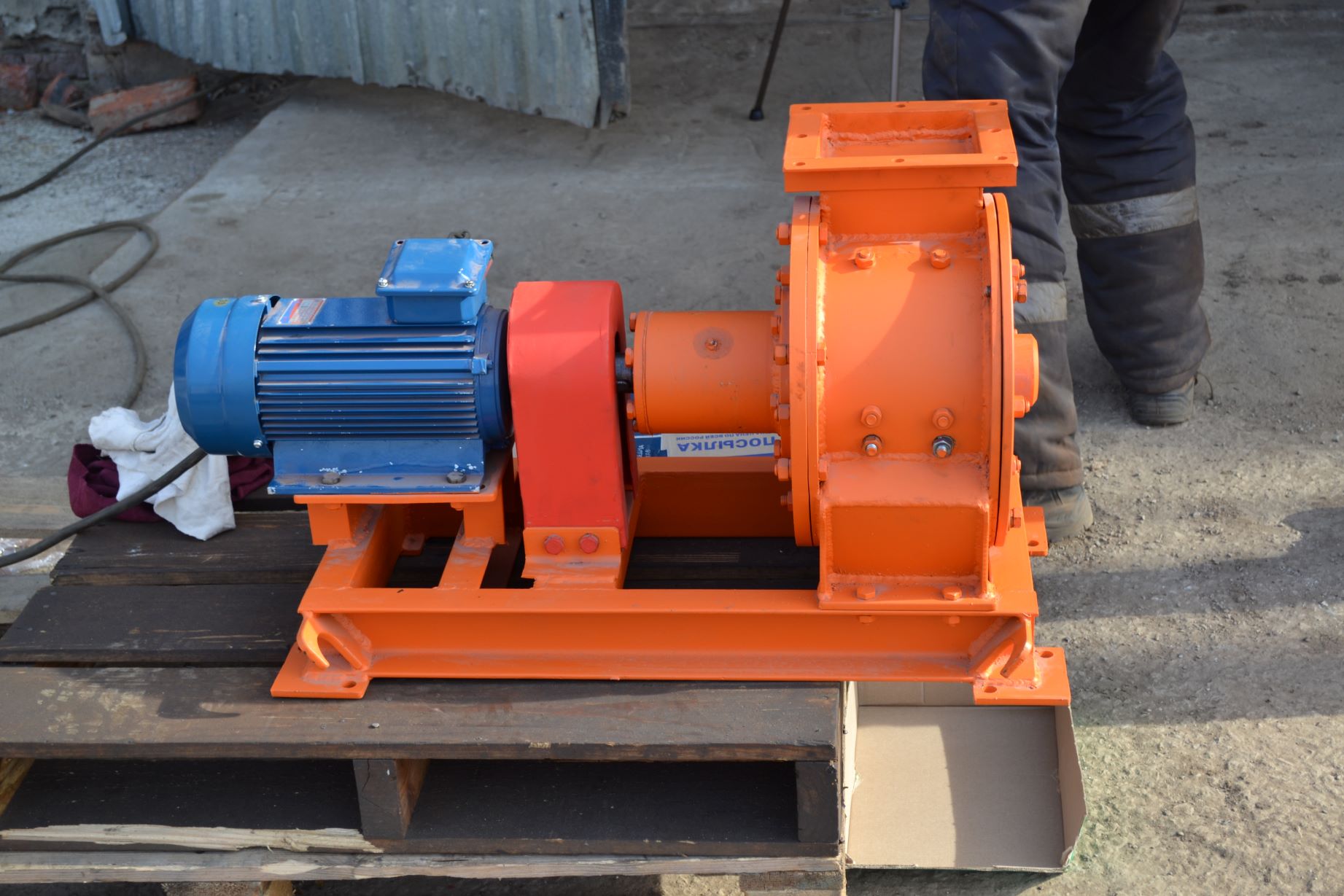Привод осуществляется от электродвигателя (поз. 1) посредством втулочно-пальцевой муфты (поз. 2). Ротор (поз. 6), смонтирован в подшипниковых опорах (поз. 3), установленных на корпусе (поз. 4). Электродвигатель и корпус установлены на общей раме (поз. 5). Загрузка исходного материала производится через патрубок загрузки (поз. 7). В нижней части дробилки находится разгрузочное устройство (поз. 8) через которое осуществляется разгрузка материала в транспортную тару или на транспортную систему. Наружные вращающиеся части ограждены кожухом (поз. 9).
