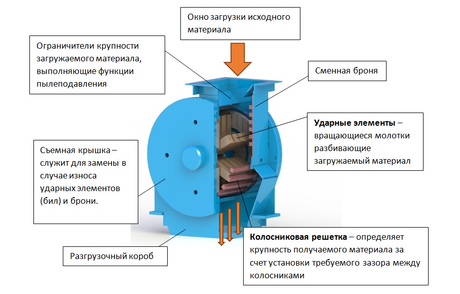 Исходный материал, непрерывно подается через загрузочную воронку. Дробление происходит за счет удара сырья о молотки, отбойники броней и колосниковых решеток. Готовый продукт просыпается сквозь отверстия в решетке.