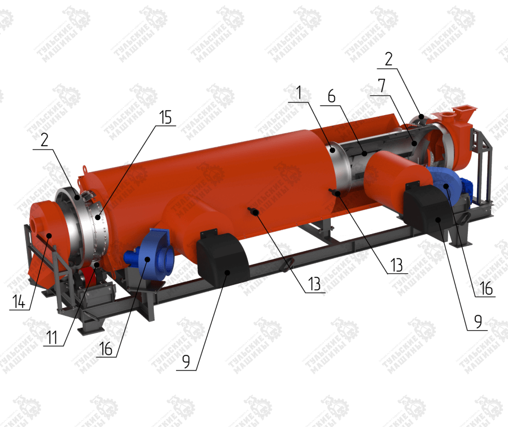В загрузочной части 8 печи присутствует отверстие для приточной вентиляции. Приточная вентиляция в комплект поставки не входит. Печь косвенного нагрева укомплектована устройством выгрузки 14.