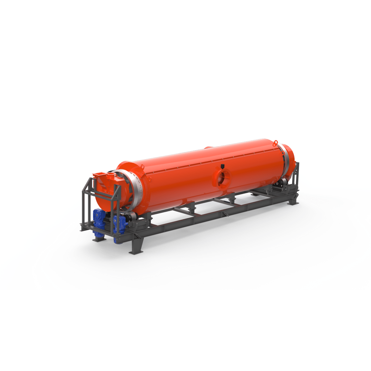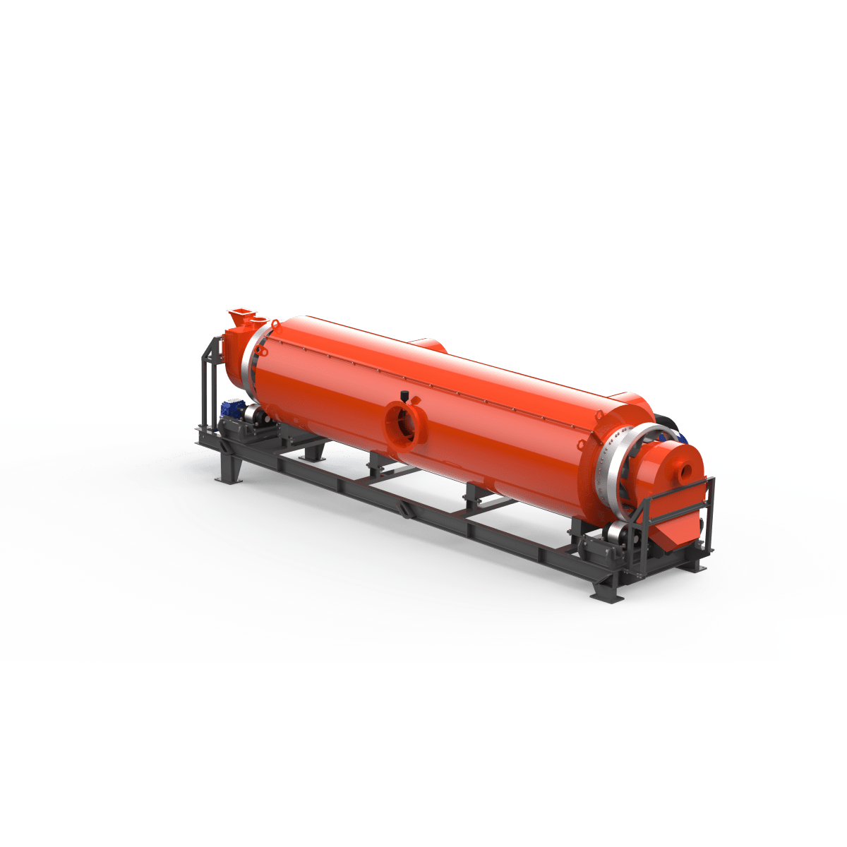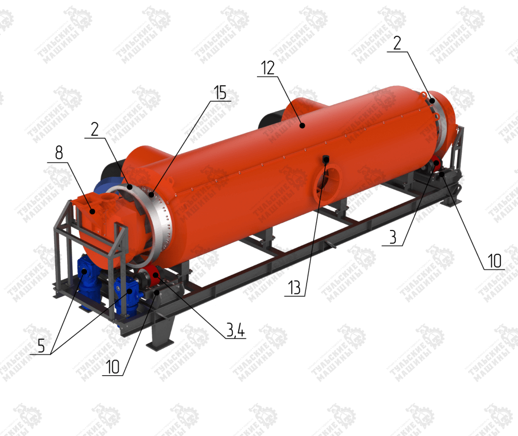 Корпус печи косвенного нагрева представляет собой внутренний корпус 1 (реторту) диаметром 630мм, сваренную из отдельных обечаек. К трубе приварены опорные бандажи 2, обеспечивающие опору и вращение печи на двух группах опорных роликов 3. Приводные ролики 4, обеспечивающие передачу крутящего момента от приводного устройства 5 . Винтовая насадка 7 в зоне загрузки позволяет подавать материал в зону с лопастными насадками (лопатками) 6 для эффективной сушки материала из загрузочного устройства 8.