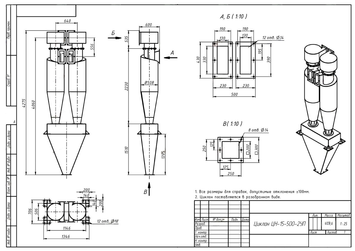 - 500 — внутренний диаметр цилиндрической части циклона (мм.)