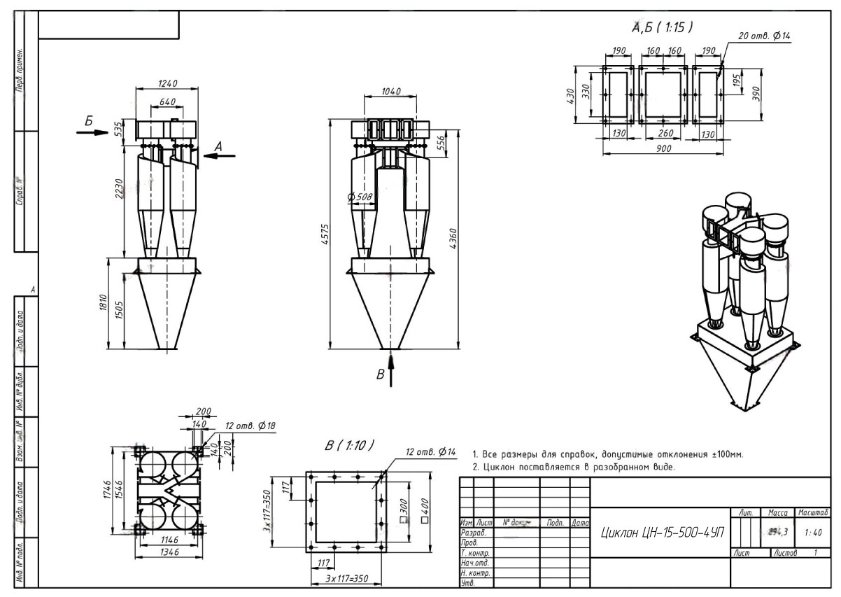 - 500 — внутренний диаметр цилиндрической части циклона (мм.)