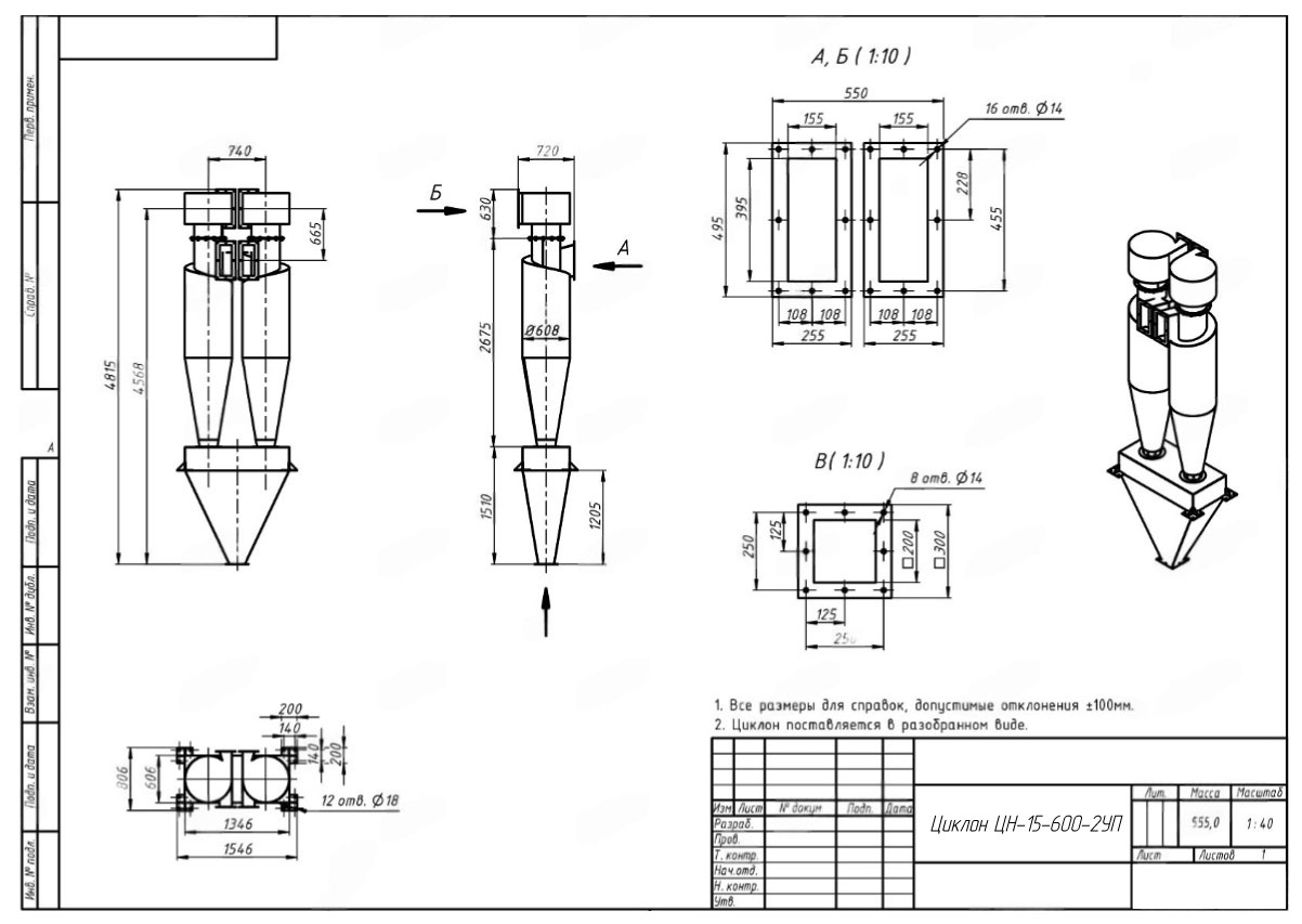 Циклон ЦН-15-600-2УП применяется для сухой очистки газов и воздуха от твердых не слипающихся частиц пыли размером более 5 мкм и температурой газов до 400 ºС и начальной запыленностью до 400 г/м³.