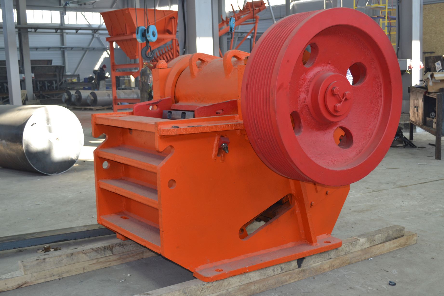 Дробилка состоит из корпуса, на котором смонтирована подвижная щека с двигающейся дробящей плитой, валом и подшипниками. На передней стенке корпуса закреплена неподвижная дробящая плита.