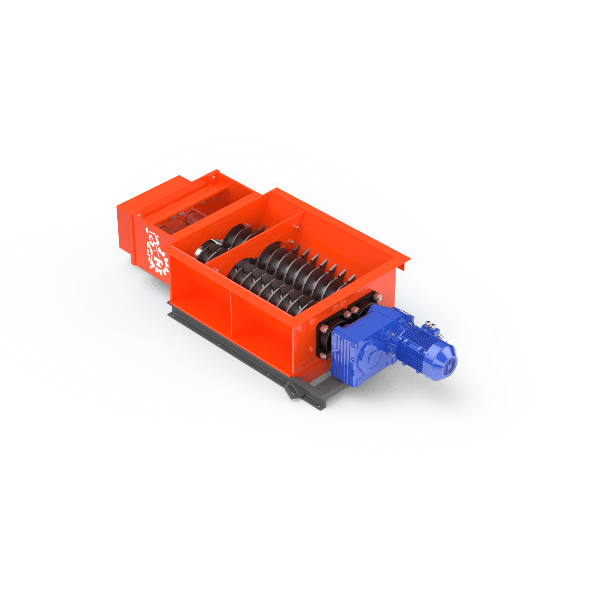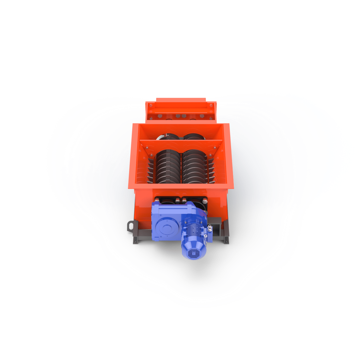 Привод осуществляется от мотор-редуктора 5. Крутящий момент между валами передается посредством зубчатой передачи 3. Валы с дисками, далее роторы 1 расположены в корпусе 2 и крепятся в подшипниковых опорах 4. Нижняя часть корпуса имеет наклон в 45 градусов и отверстие для разгрузки перед шредером. Зубцы из твердого сплава находятся под цифрой 6.