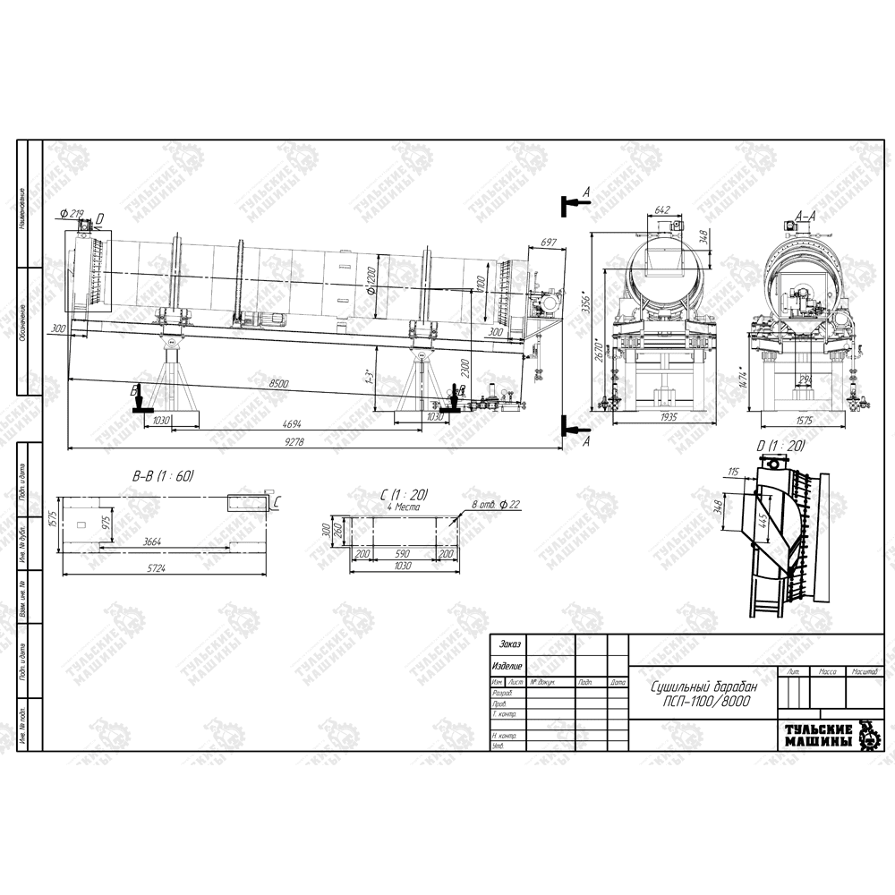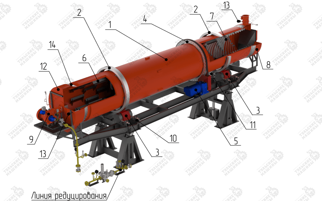Корпус сушильного барабана представляет собой корпус 1 (трубу) диаметром 1100мм, сваренную из отдельных обечаек. К трубе приварены опорные бандажи 2, обеспечивающие опору и вращение печи на двух группах опорных роликов 3. Венец 4, обеспечивающий передачу крутящего момента от приводного устройства 5 через цепь. Винтовая насадка 7 (сушильный барабан может комплектоваться цепной завесой вместо винтовой насадки, для исключения налипания материала на стенки барабана ) в зоне загрузки позволяет подавать материал в зону с лопастными насадками (лопатками) 6 для эффективной сушки материала, из загрузочного устройства 8.
