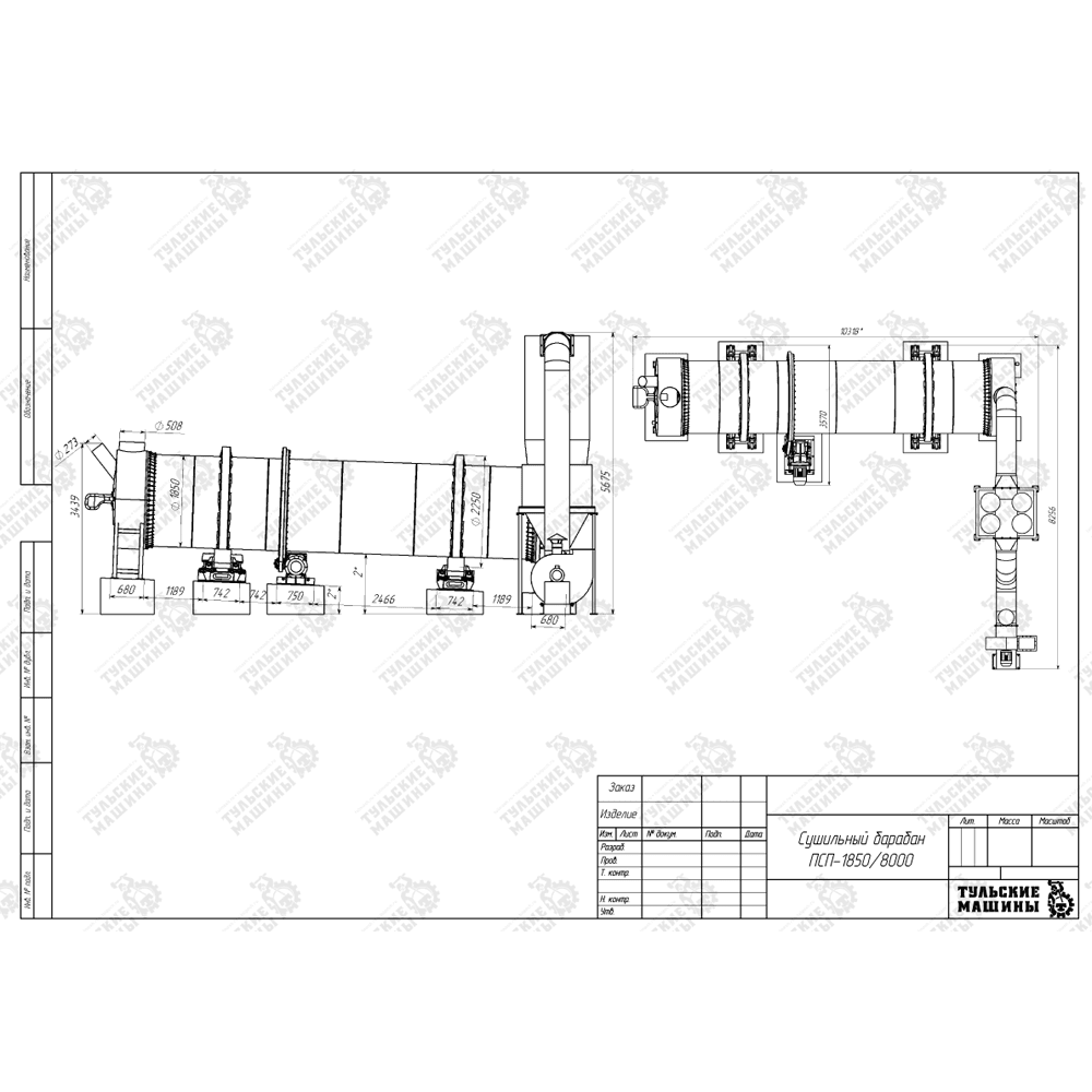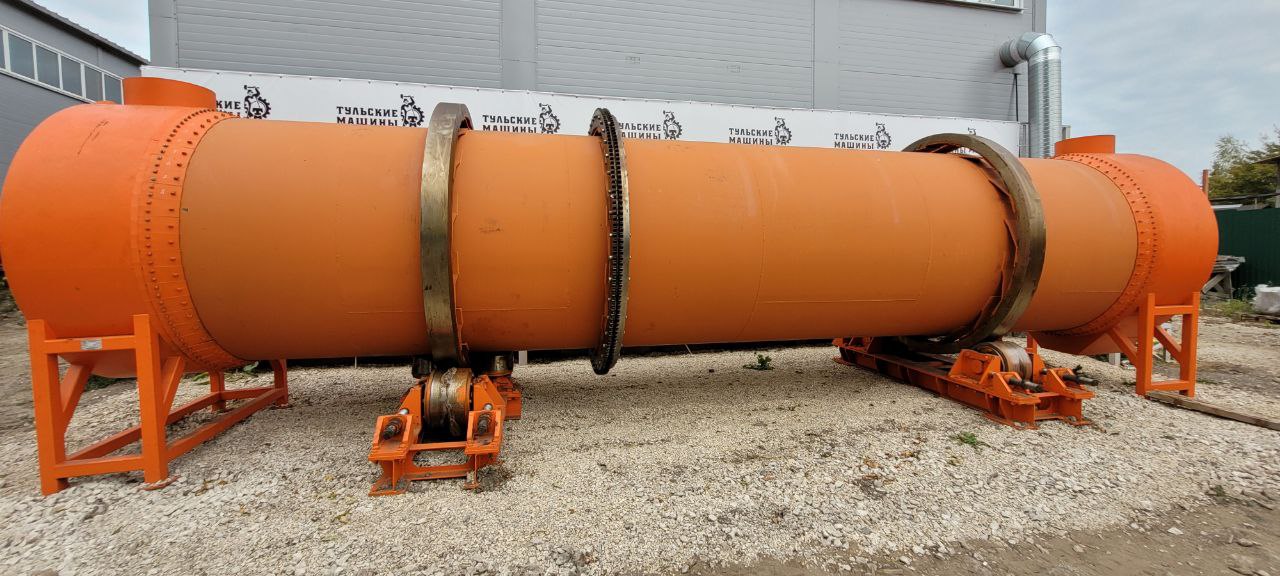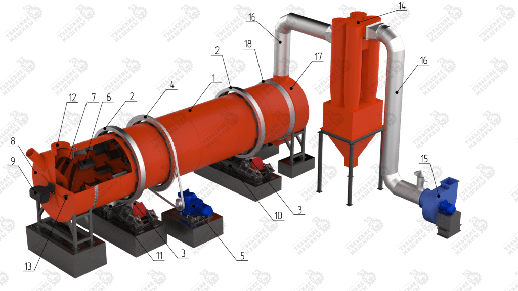 Корпус сушильного барабана представляет собой корпус 1 (трубу) диаметром 1850мм, сваренную из отдельных обечаек. К трубе приварены опорные бандажи 2, обеспечивающие опору и вращение печи на двух группах опорных роликов 3. Венец 4, обеспечивающий передачу крутящего момента от приводного устройства 5 через цепь. Винтовая насадка 7 в зоне загрузки позволяет подавать материал в зону с лопастными насадками (лопатками) 6 для эффективной сушки материала, из загрузочного устройства 8.