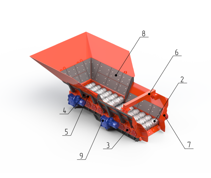 - Подача материала – сыпучий материал поступает через загрузочный лоток на вращающиеся валки.