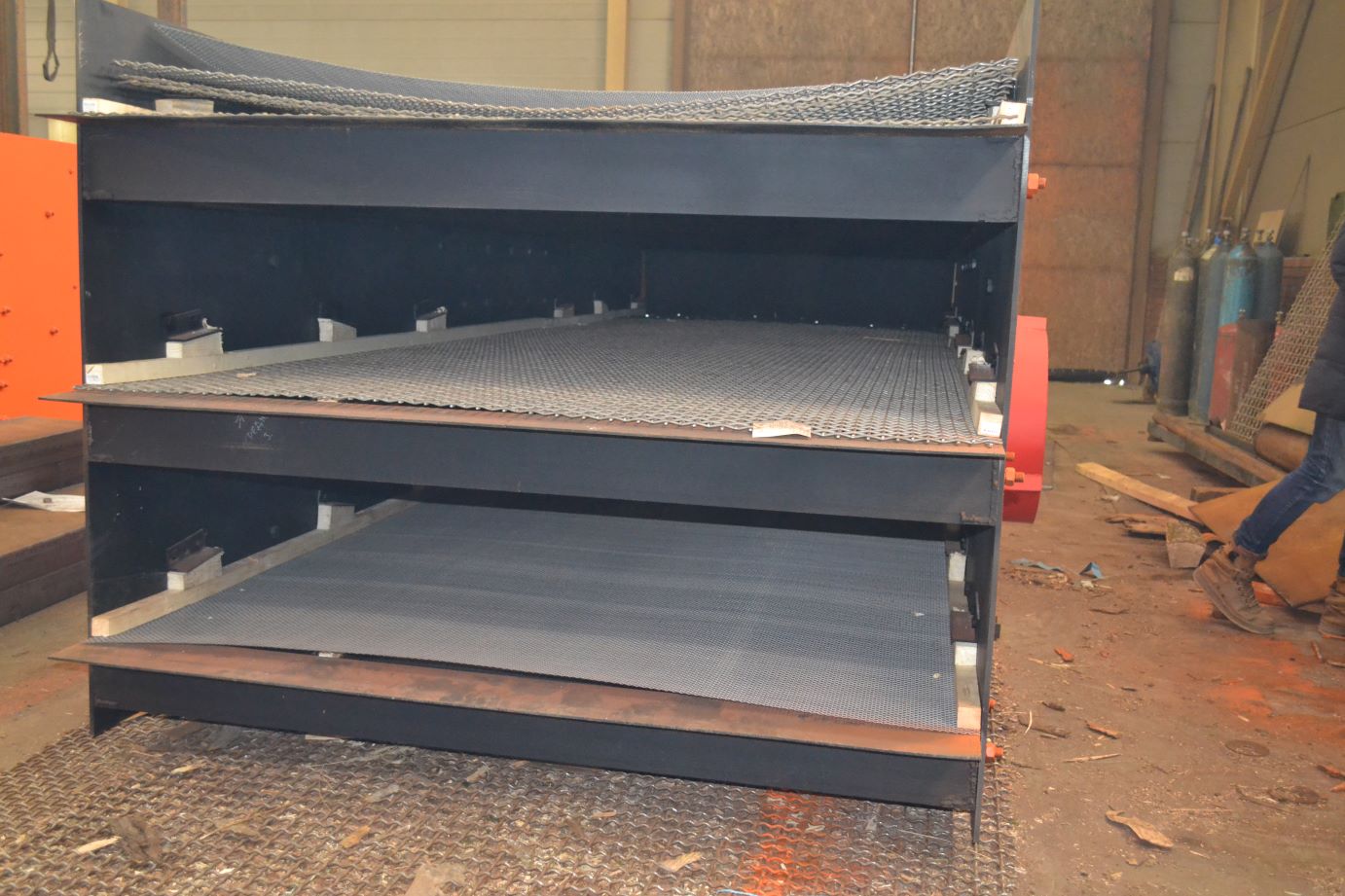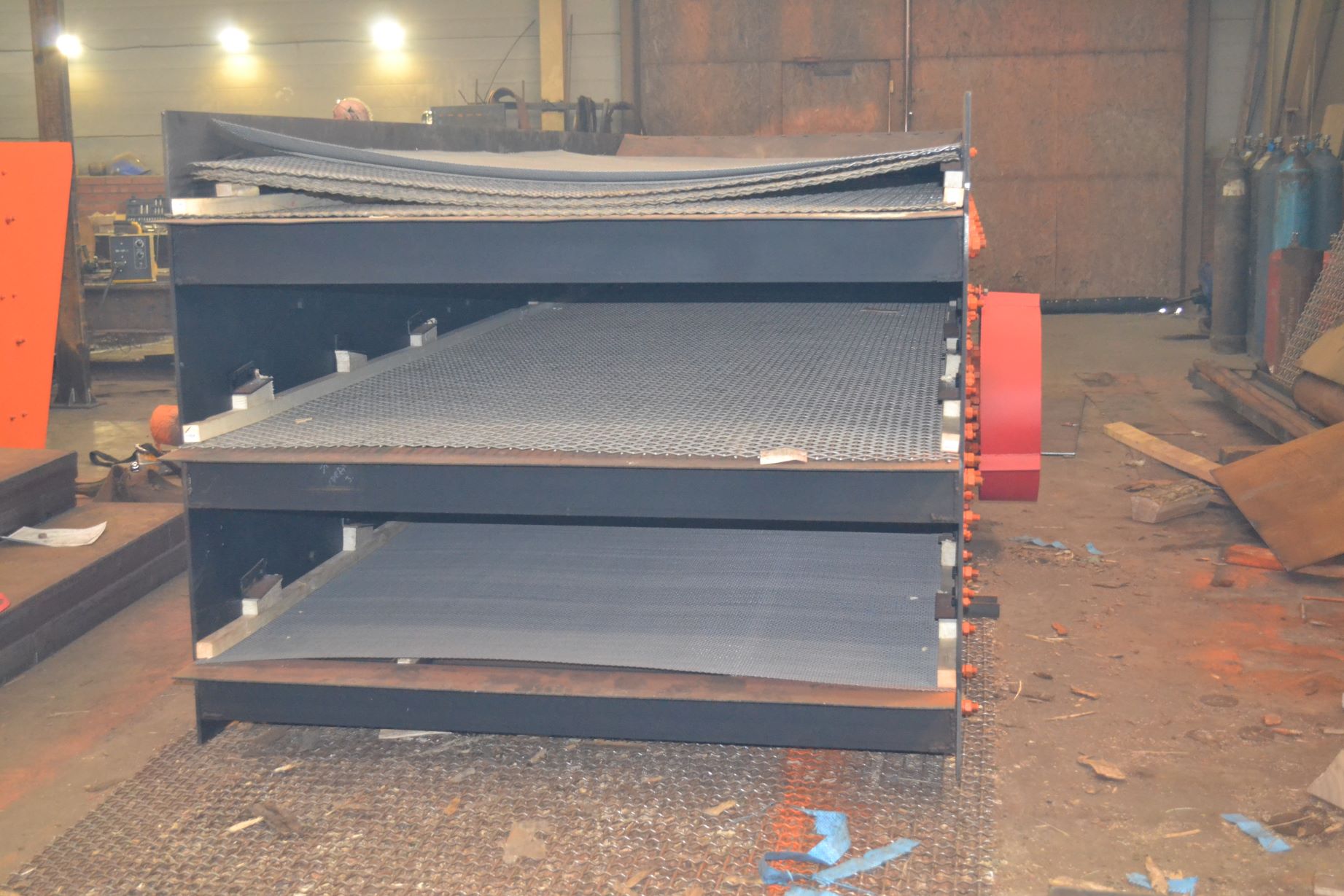 Грохот работает следующим образом: из загрузочного бункера материал для рассева подается на верхнее сито. Оказываясь там, он доставляется в сторону наклона короба. Материал, крупность которого меньше отверстий в сетке просыпается на нижнее сито, а более крупный доходит до края сита и по желобу ссыпается в приемную емкость. Прошедший через отверстие первого сита материал рассеивается на следующем сите на два вида крупности и т.д. Самый мелкий материал попадает в приемную емкость, находящуюся под выгрузным отверстием.