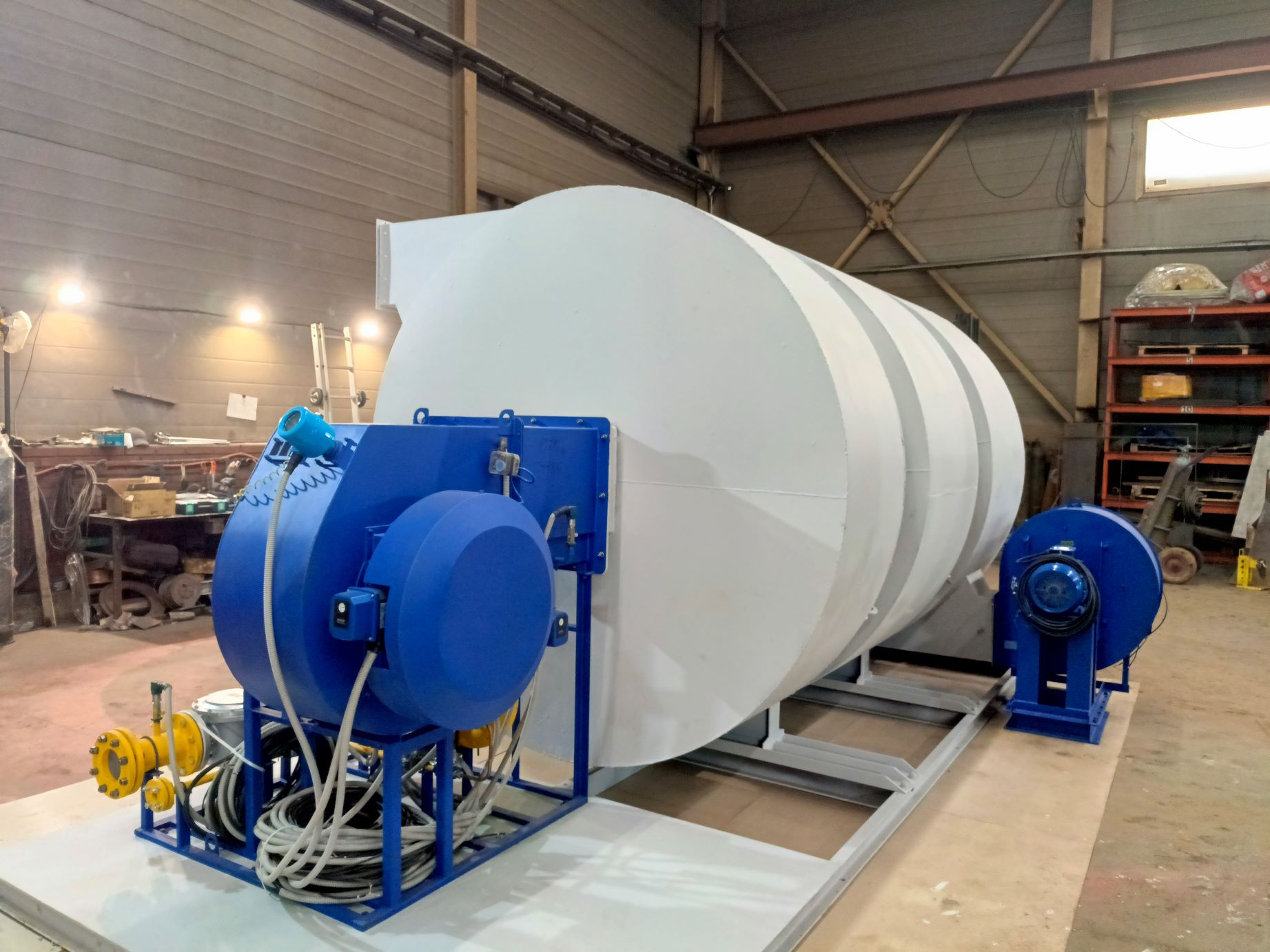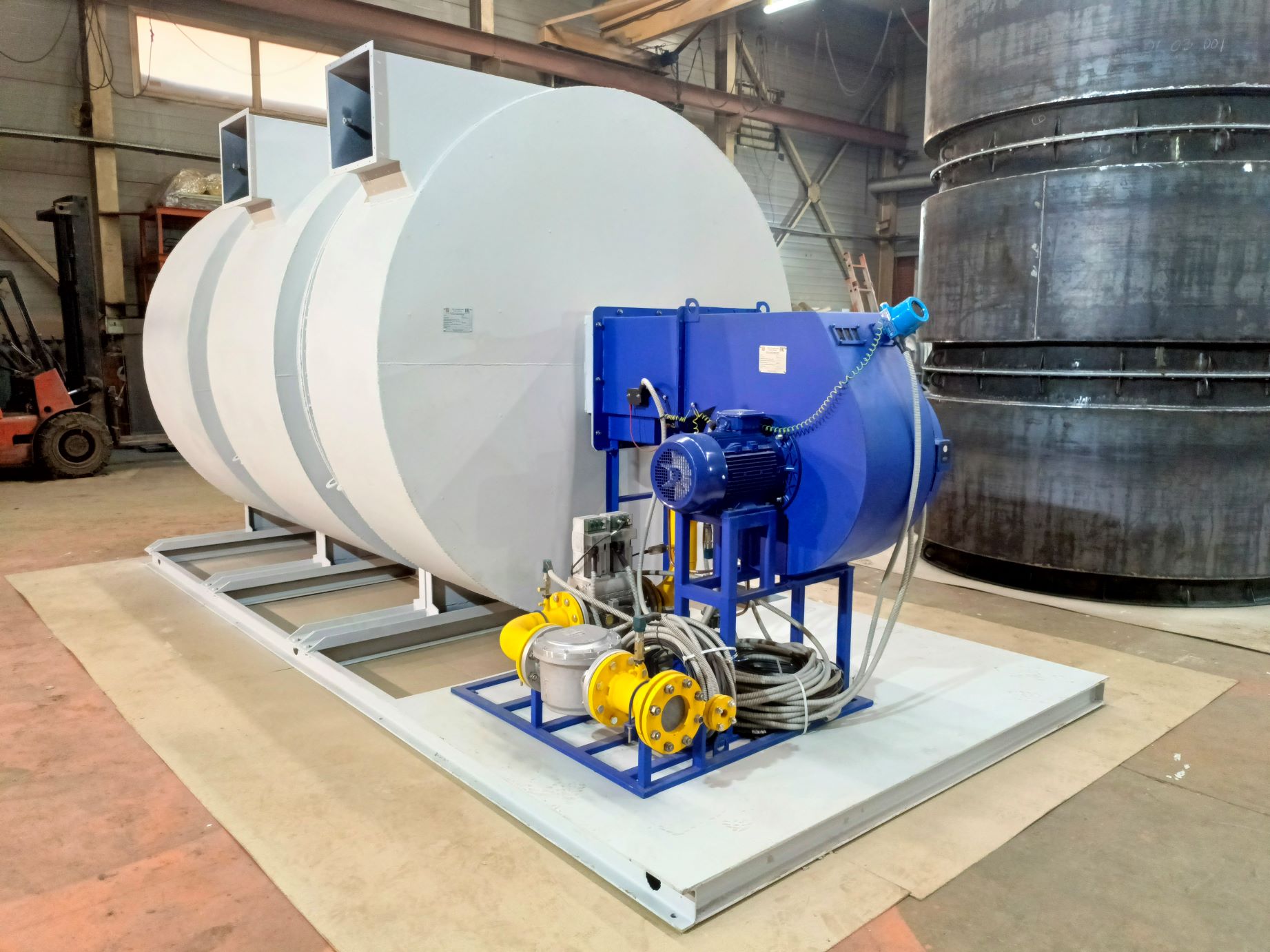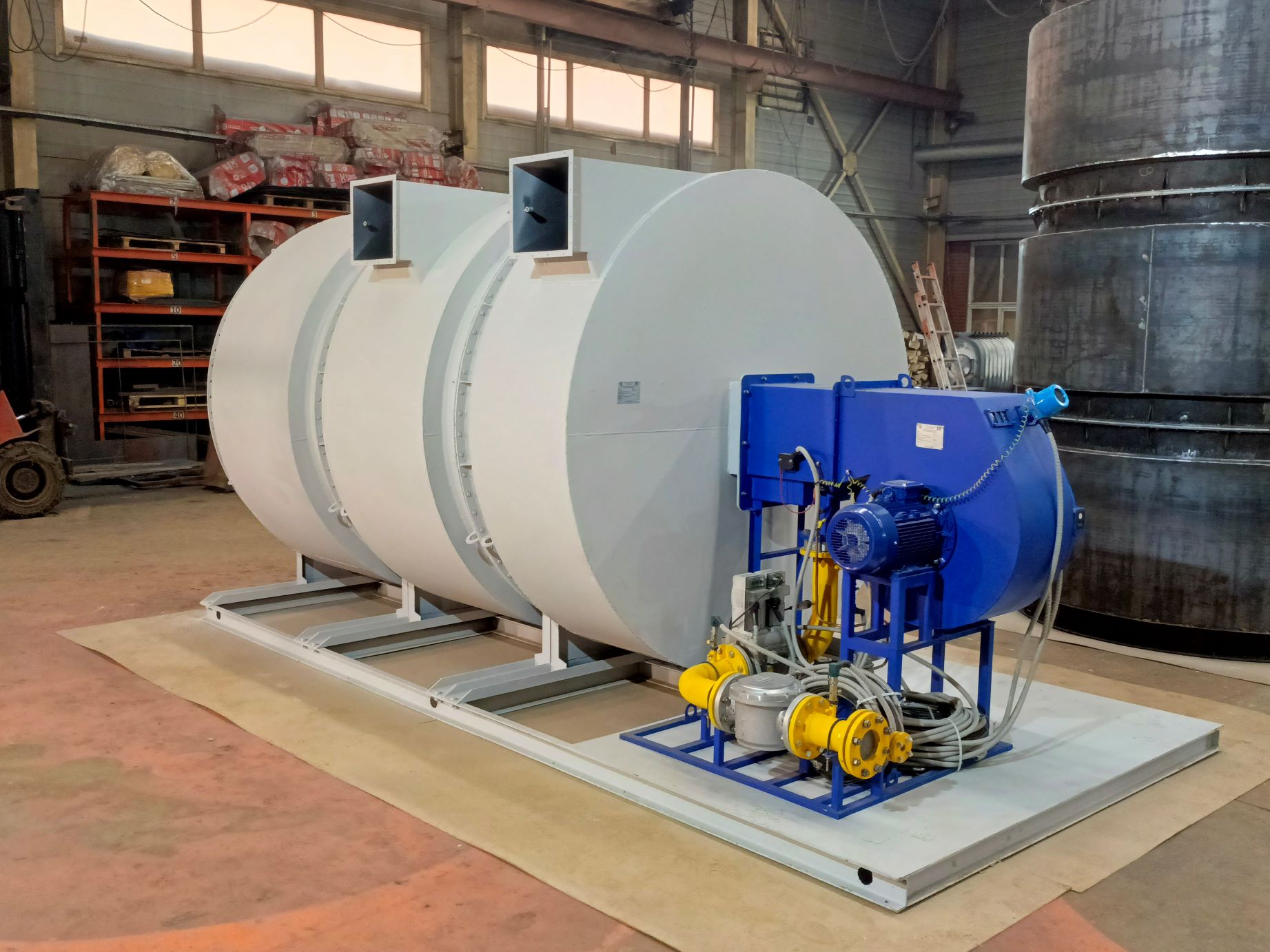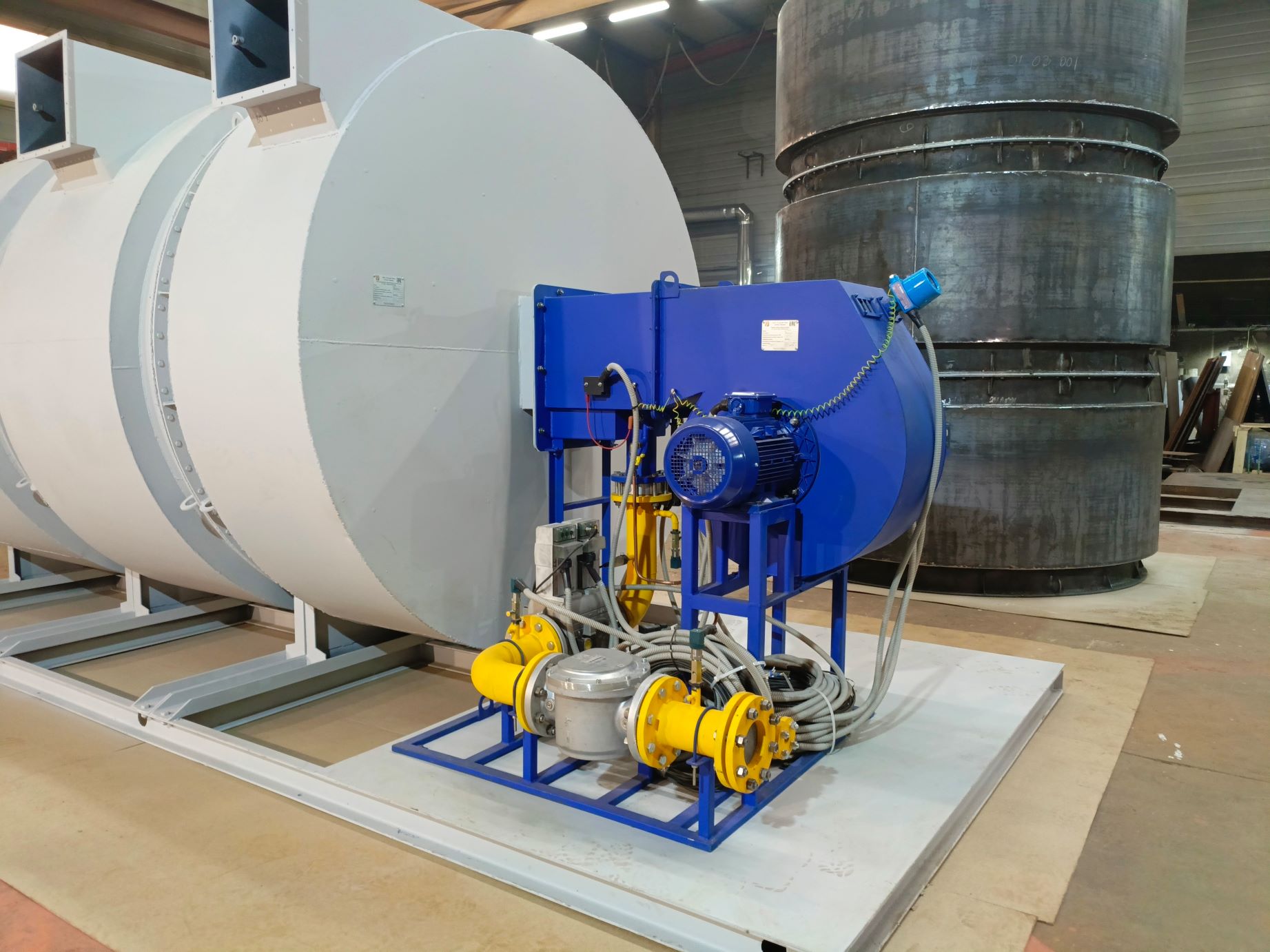 Воздухонагреватели (теплогенераторы) газовые промышленные смесительные серии СВТ служат для получения теплоносителя (газообразное вещество, применяемое для передачи тепловой энергии), который представляет собой смесь воздуха и продуктов сгорания природного газа. Тепло от факела, в нашем случае, от газовой промышленной блочной горелки, и продуктов сгорания передается по воздуху путем прямого контакта (смешения), поэтому наши теплогенераторы являются воздухонагревателями прямого нагрева. Теплогенератор представляет собой конструкцию из газовой промышленной блочной горелки, камеры сгорания смесительного типа, смонтированных на одной раме, вентиляторов, автоматики безопасности и управления.