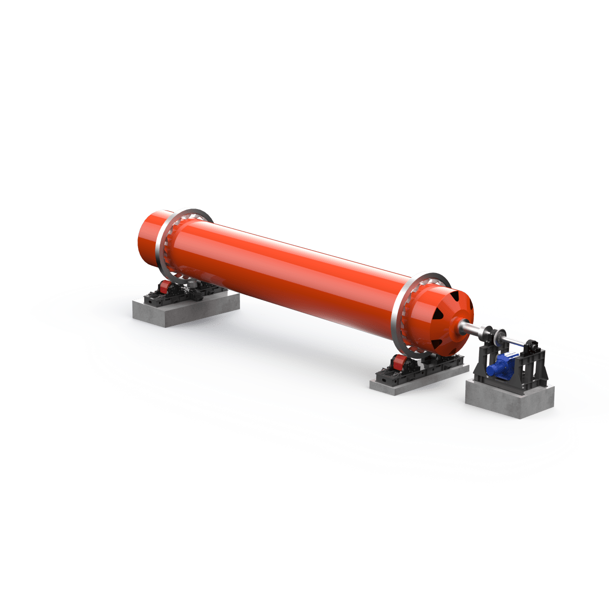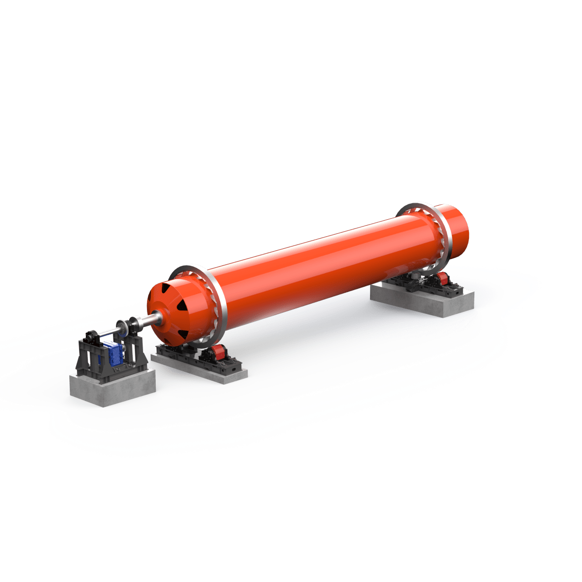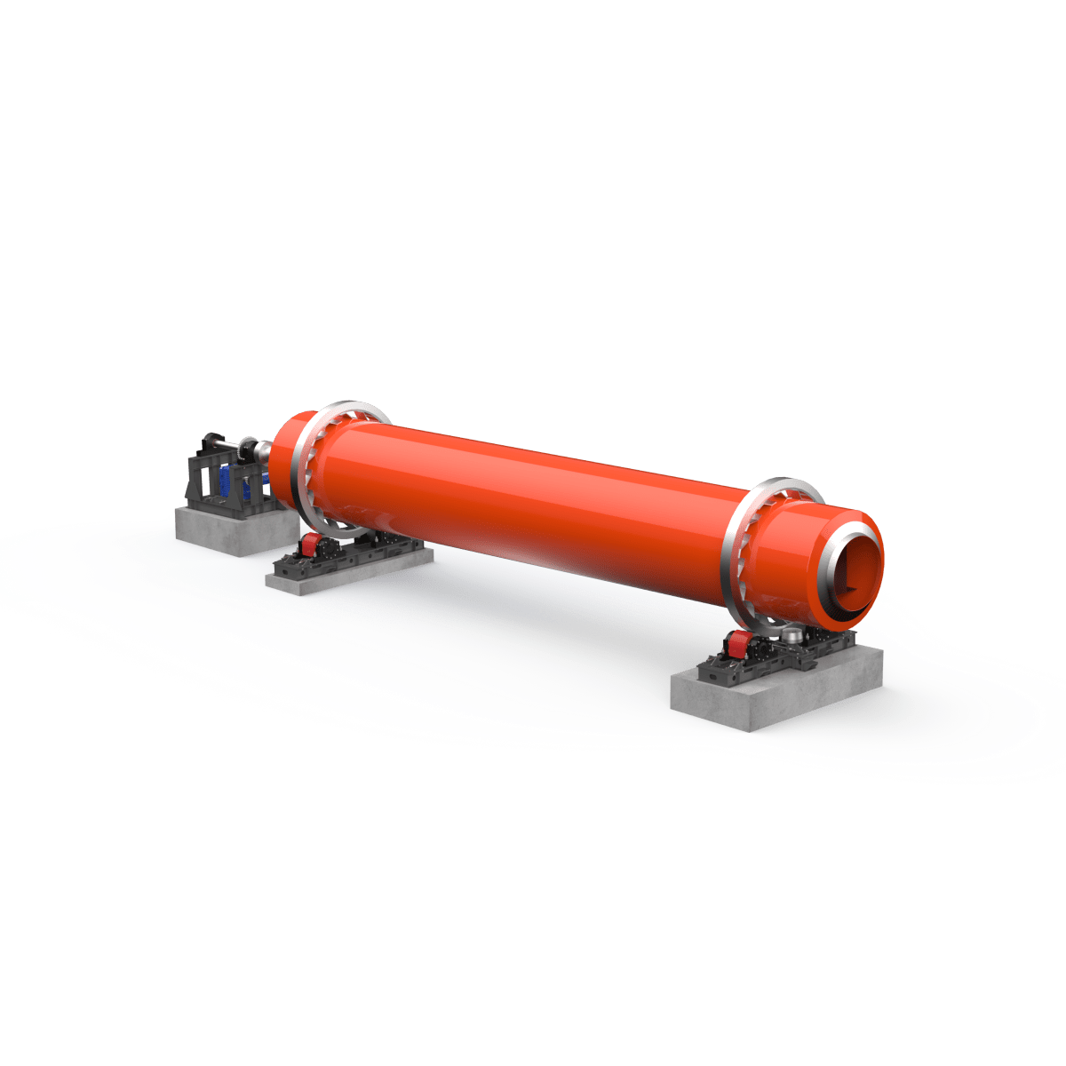 Барабан установлен на двух мощных опорных узлах, обеспечивающих стабильность и плавное вращение. Привод выполнен по цепной схеме и рассчитан на длительную, непрерывную эксплуатацию. Угол наклона барабана (около 3,5 %) создаёт естественное продвижение материала от загрузки к выгрузке. Скорость вращения — 3 об/мин.