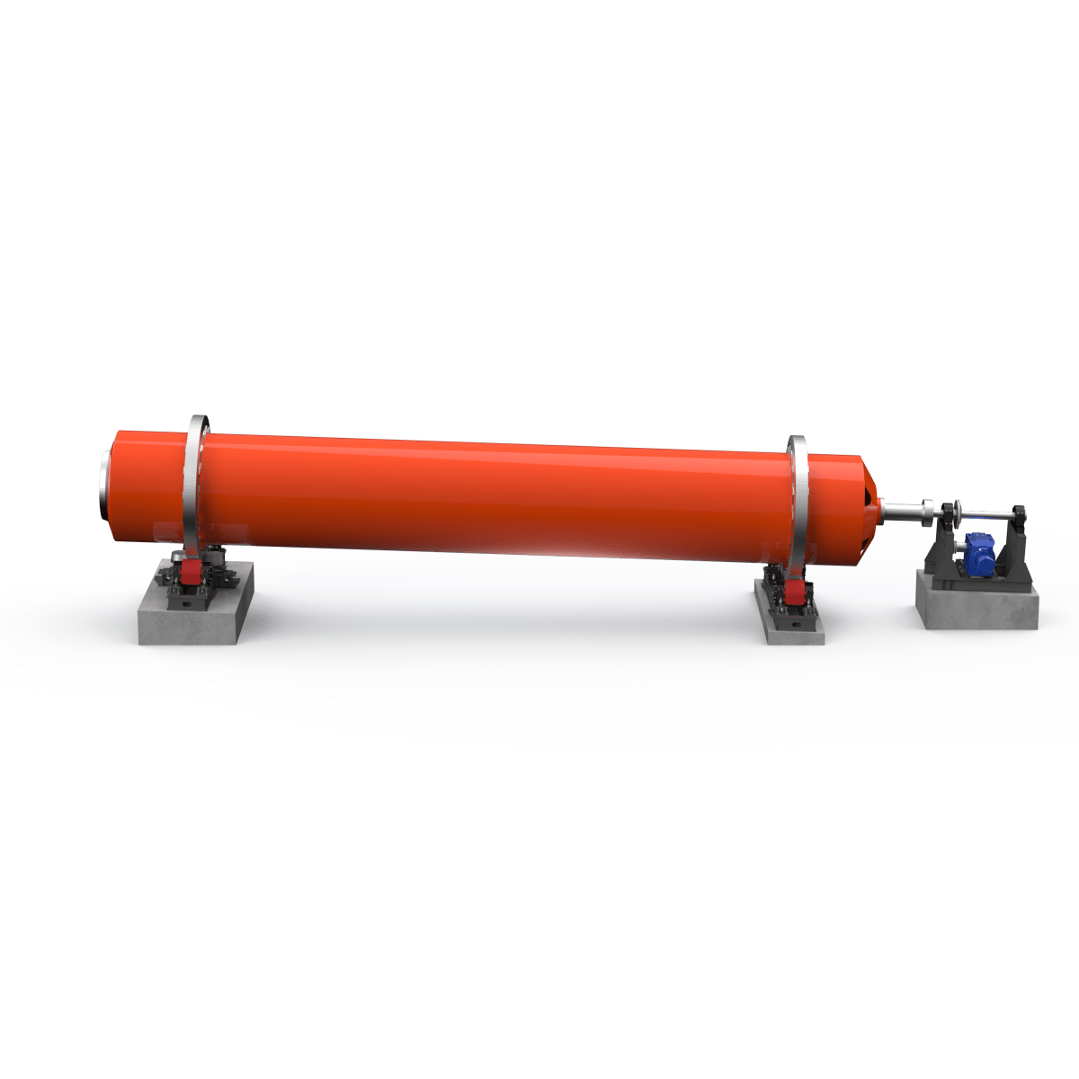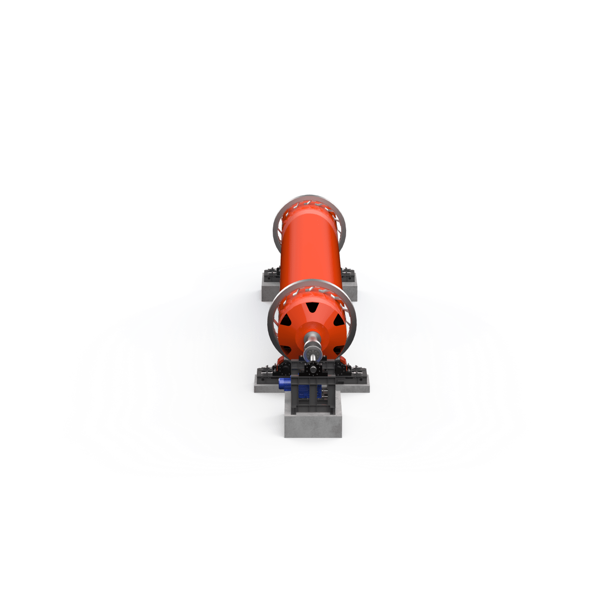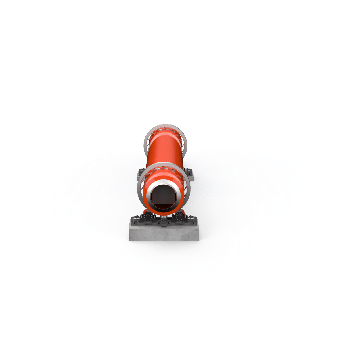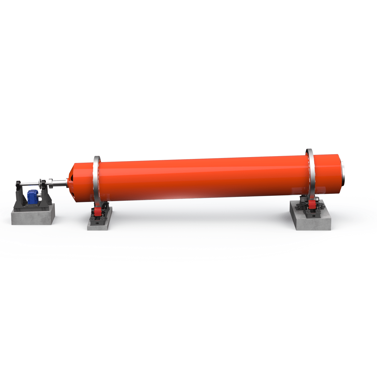 Барабан установлен на двух мощных опорных узлах, обеспечивающих стабильность и плавное вращение. Привод выполнен по цепной схеме и рассчитан на длительную, непрерывную эксплуатацию. Угол наклона барабана (около 3,5 %) создаёт естественное продвижение материала от загрузки к выгрузке. Скорость вращения — 3 об/мин.