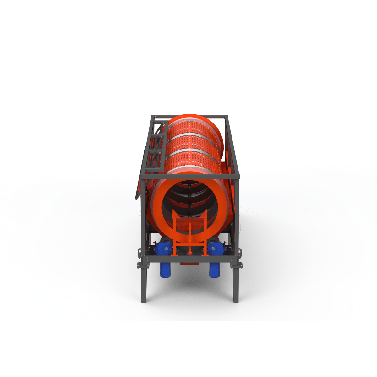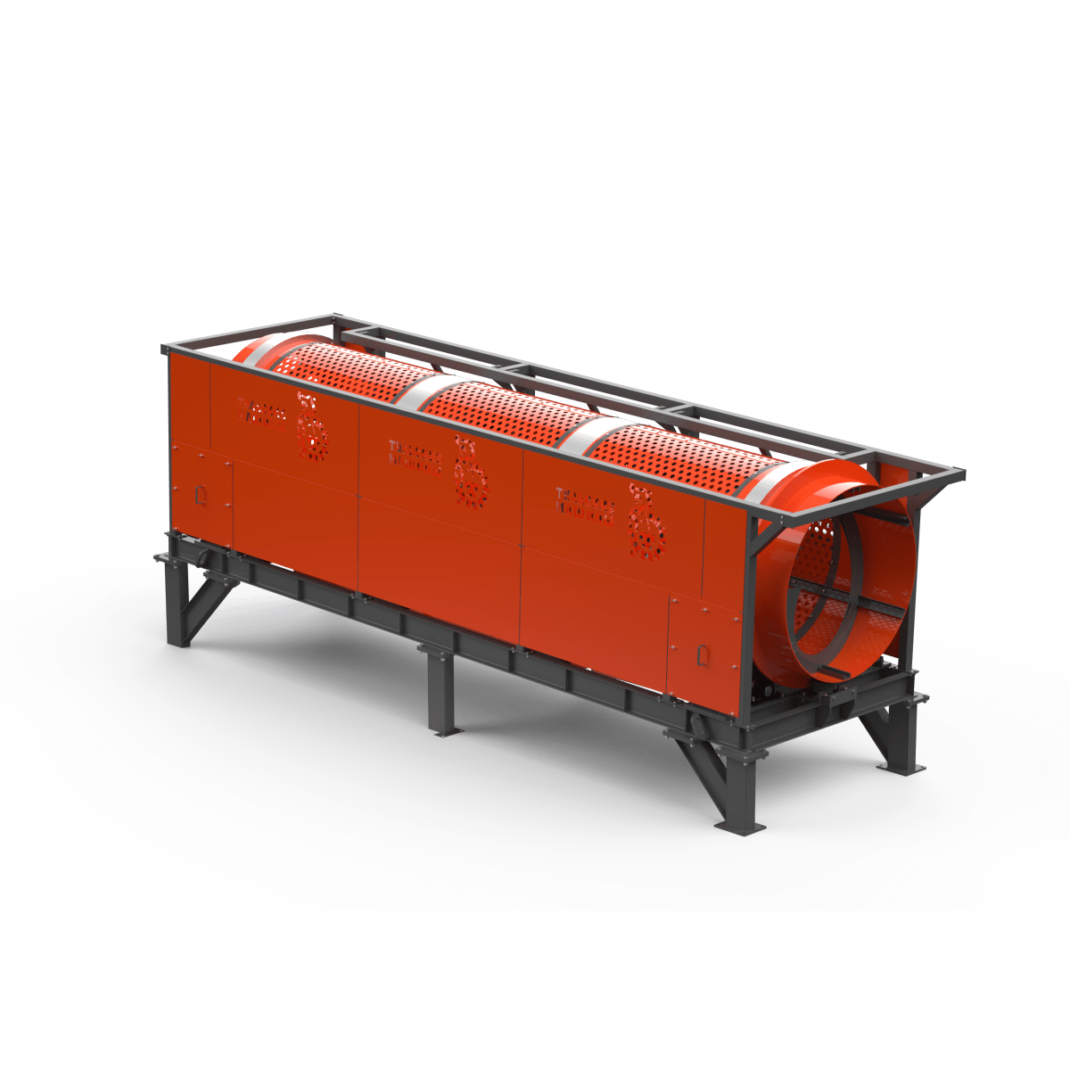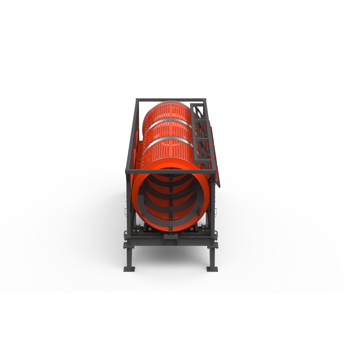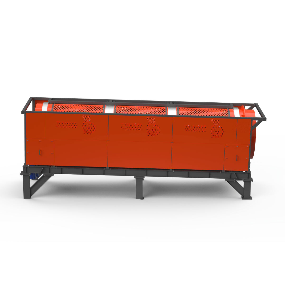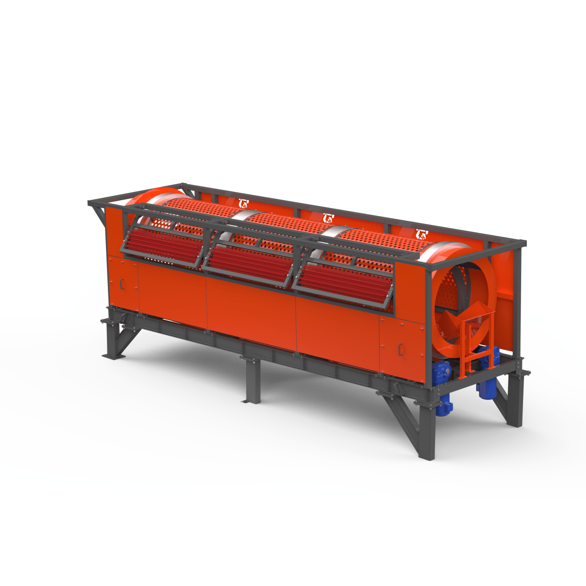 Просеивание происходит во вращающемся перфорированном барабане: материал перемешивается и продвигается вдоль оси, мелкая фракция проходит через отверстия сита, а крупная выводится через торец барабана.