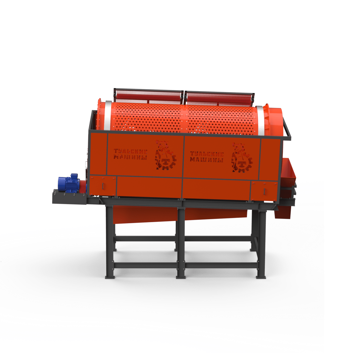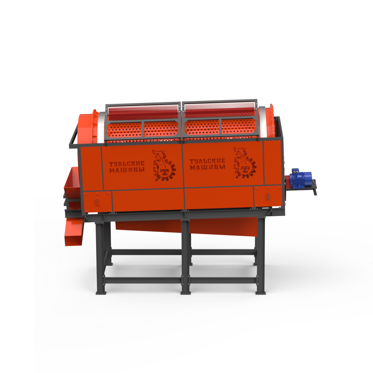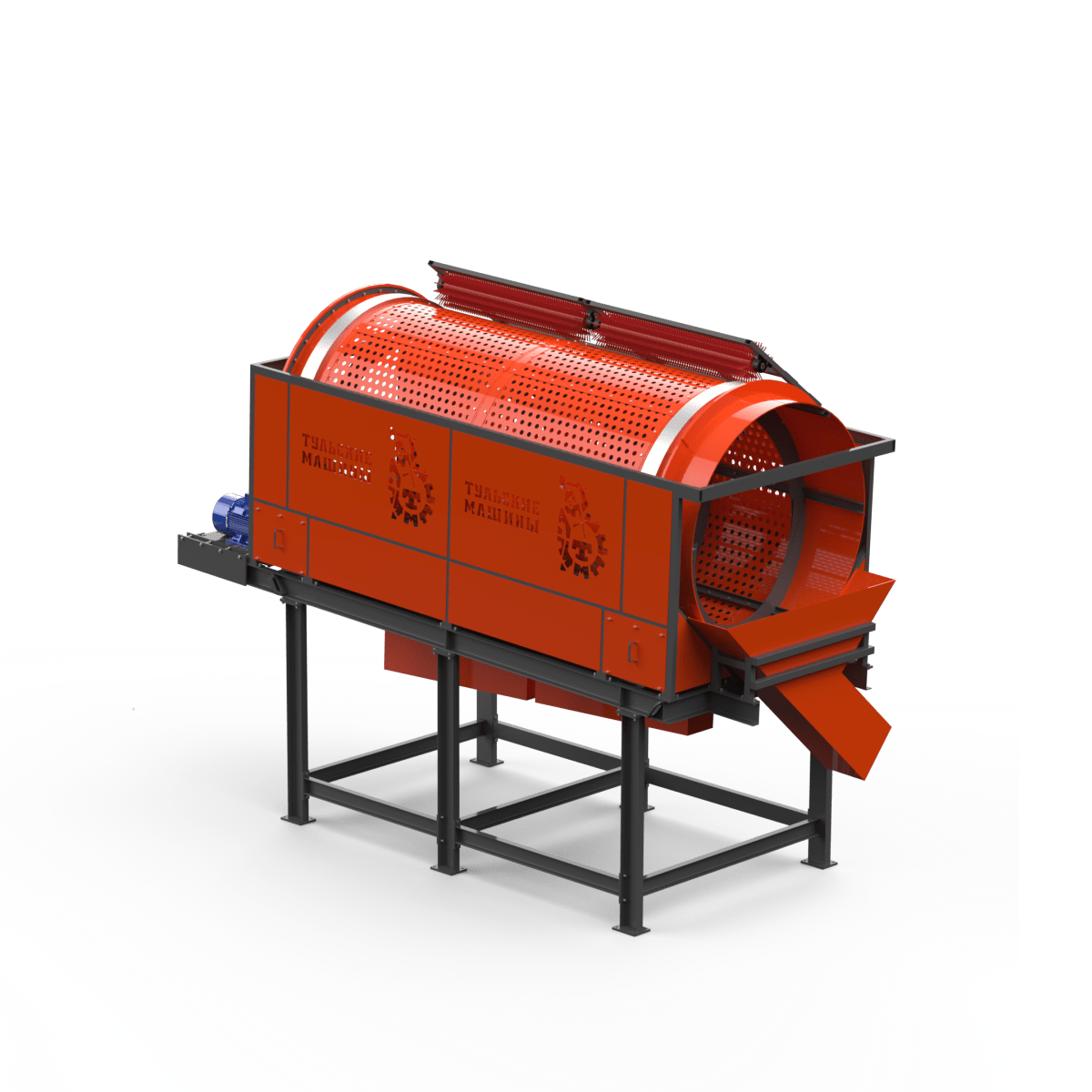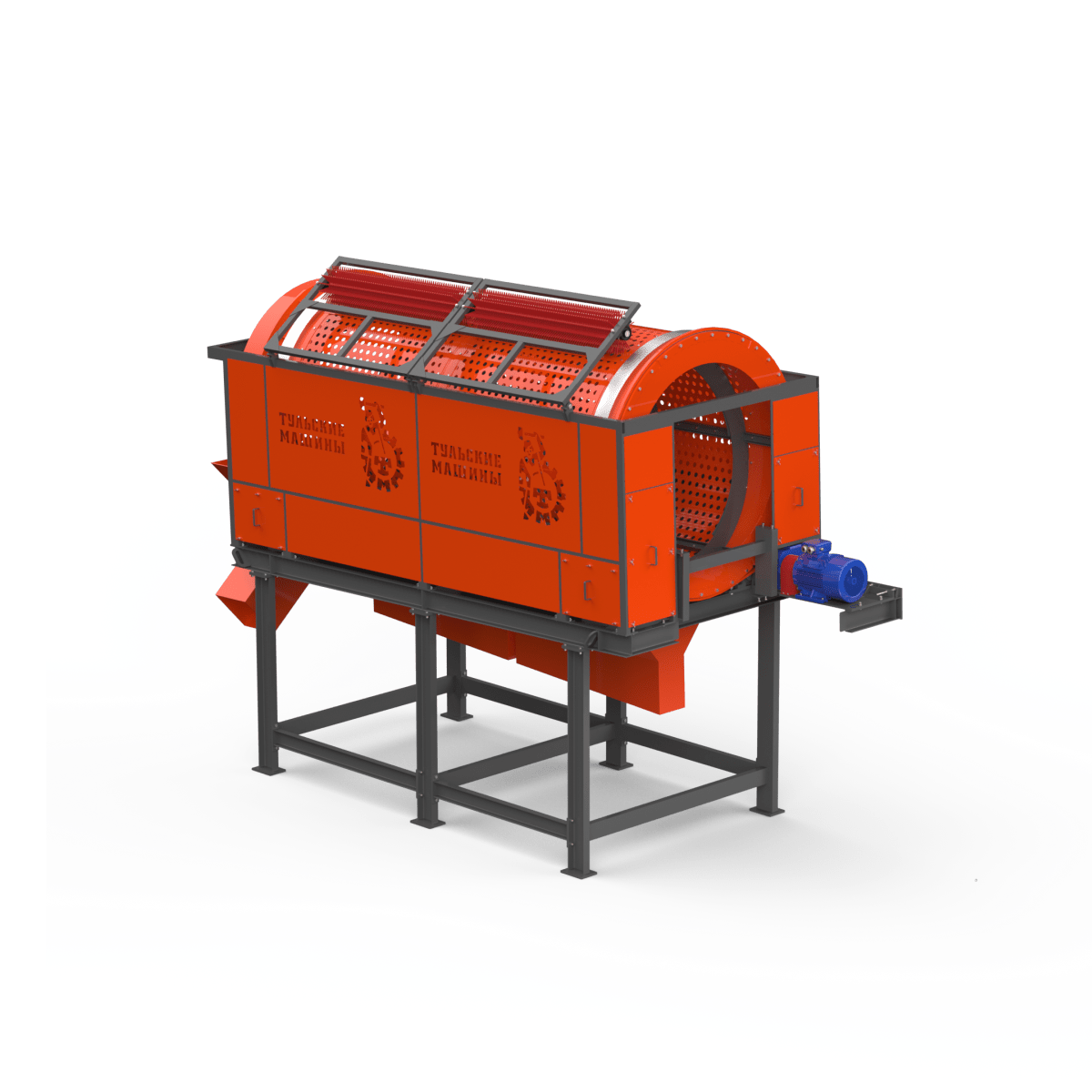 - Разделение: Мелкая фракция проходит сквозь отверстия сит, а крупные включения (надрешетный продукт) выходят через торцевое отверстие.