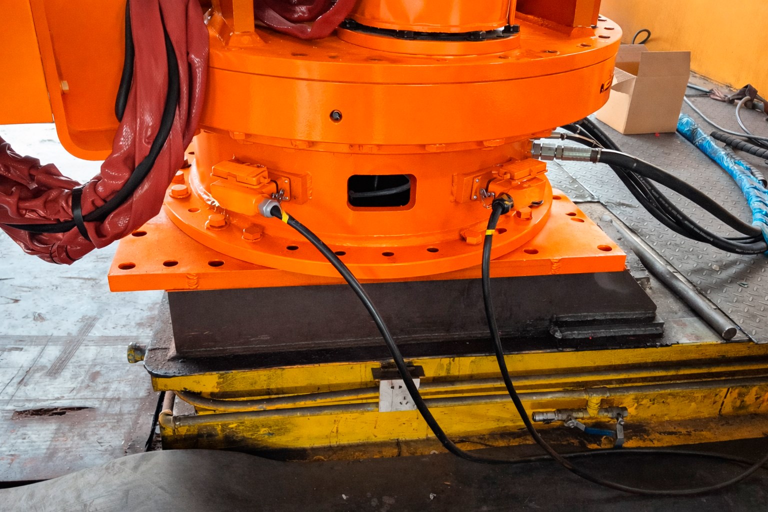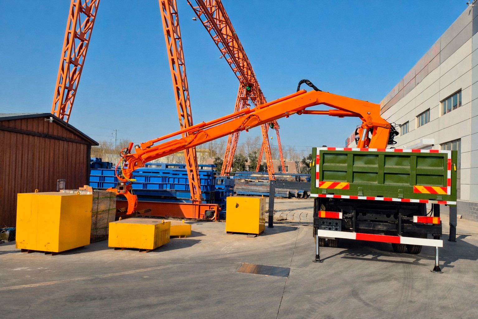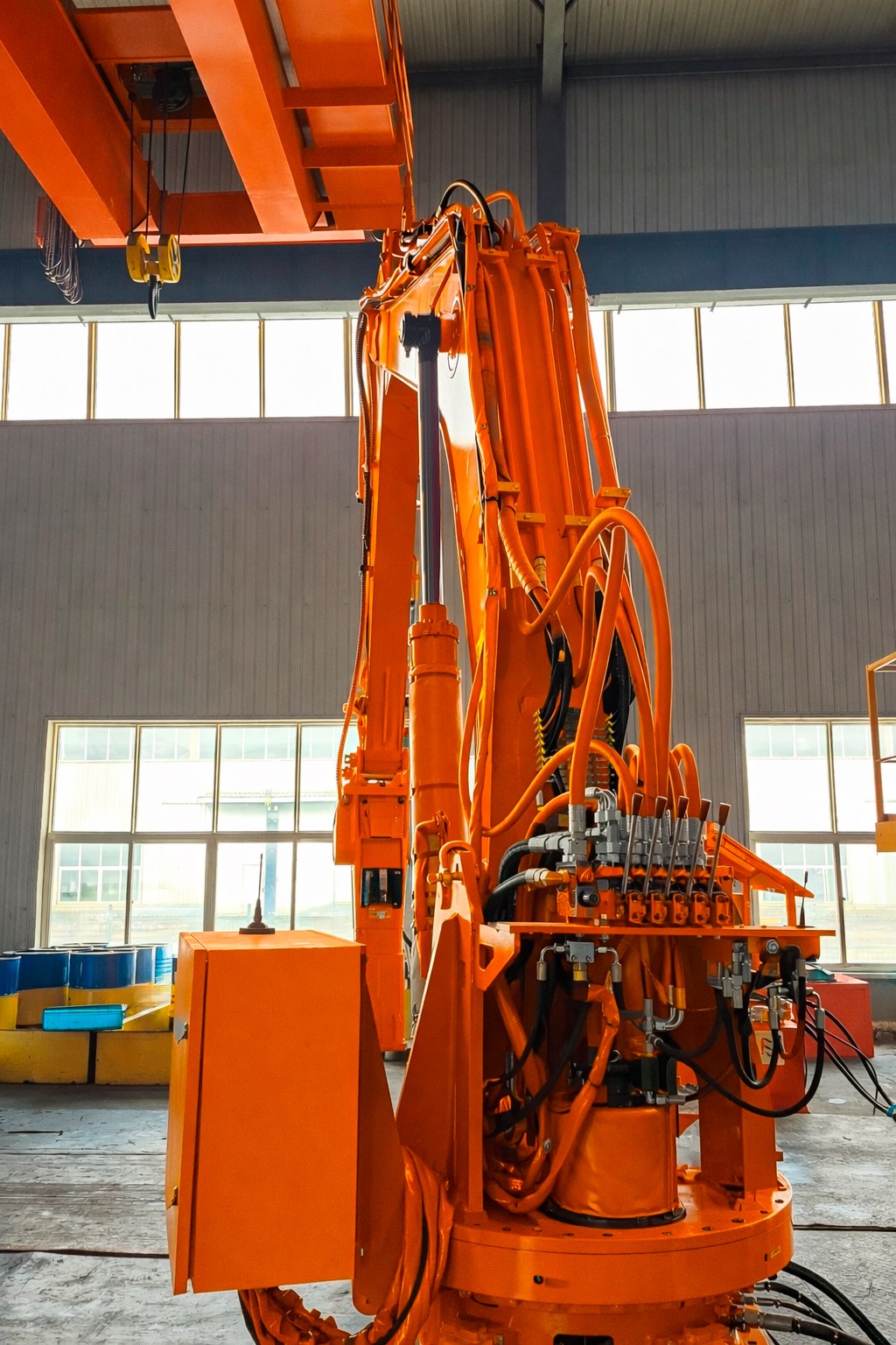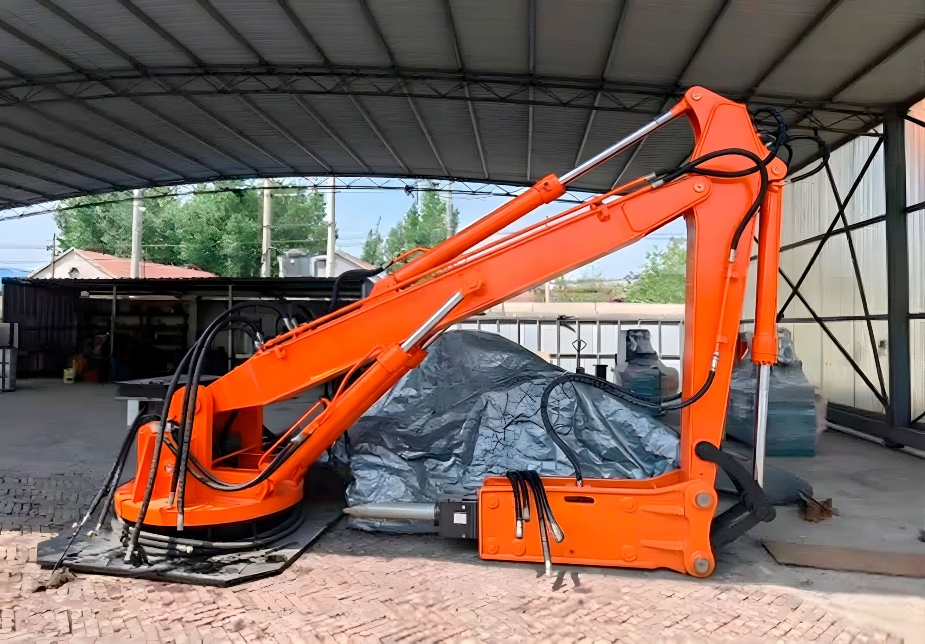 Поворот стрелы на 360° позволяет обслуживать всю площадь приёмного узла и снижает простои дробильной линии. Установка монтируется на фундамент или технологическую площадку и работает в стационарной точке.