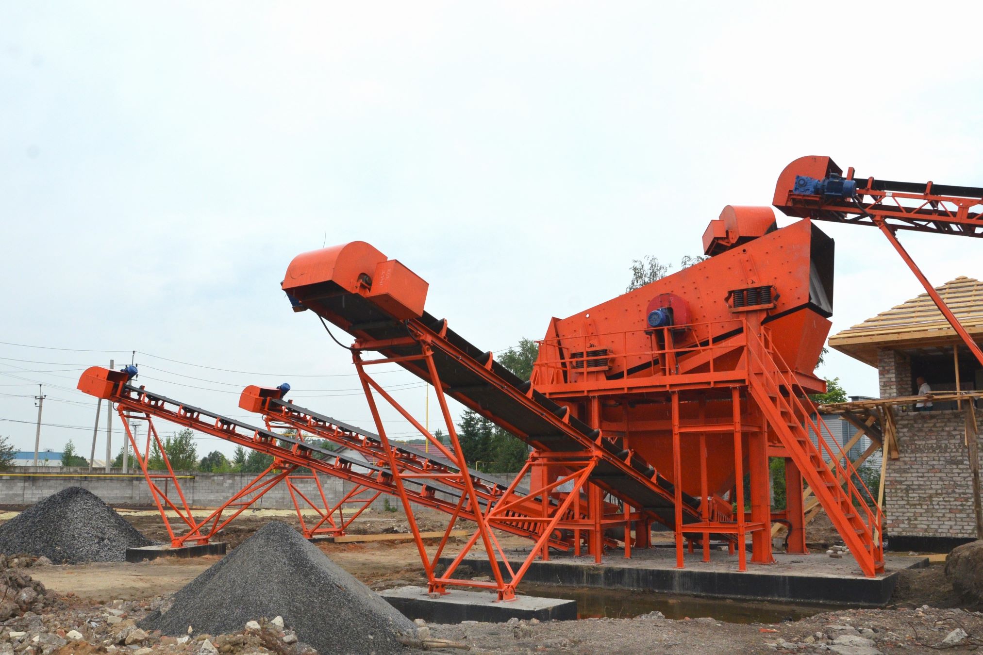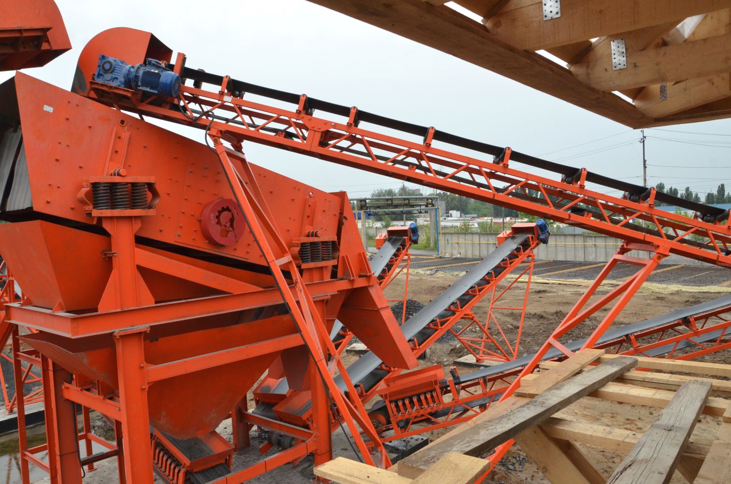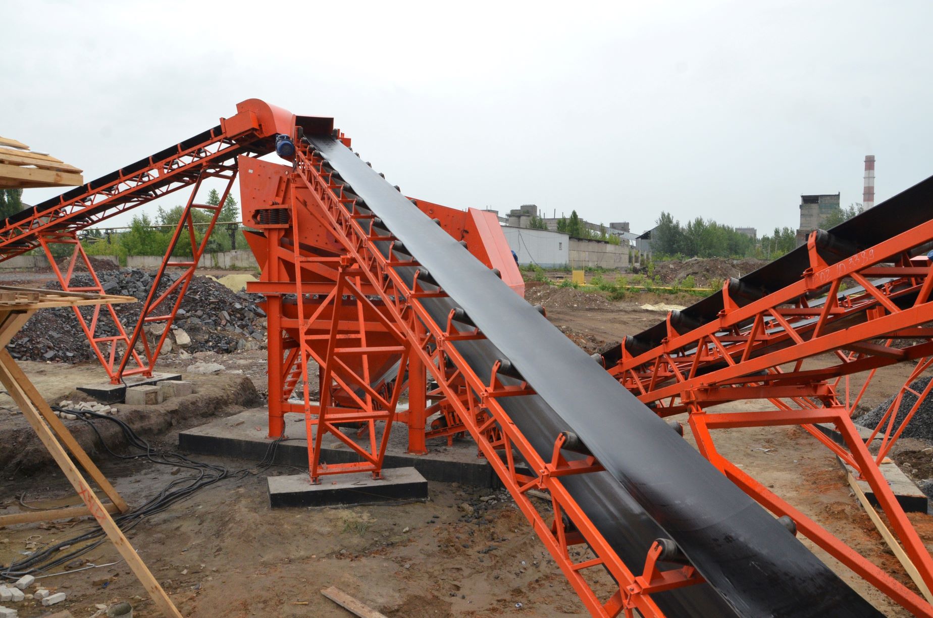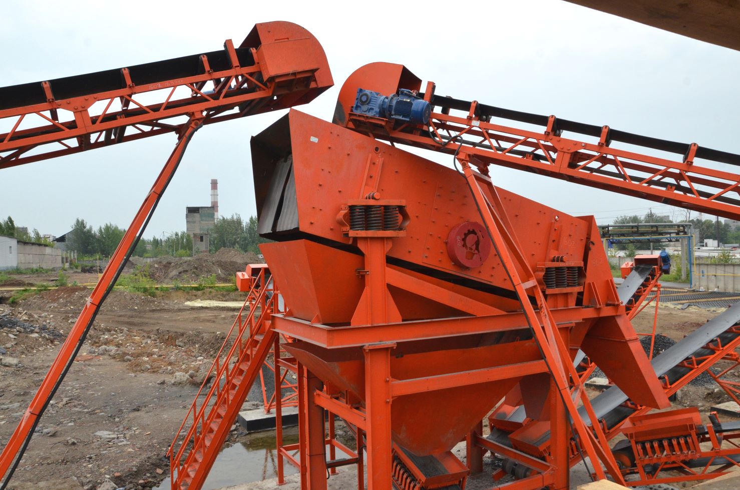 Измельченный материал для товарной классификации подается с помощью двух параллельных ленточных конвейеров на инерционный грохот.