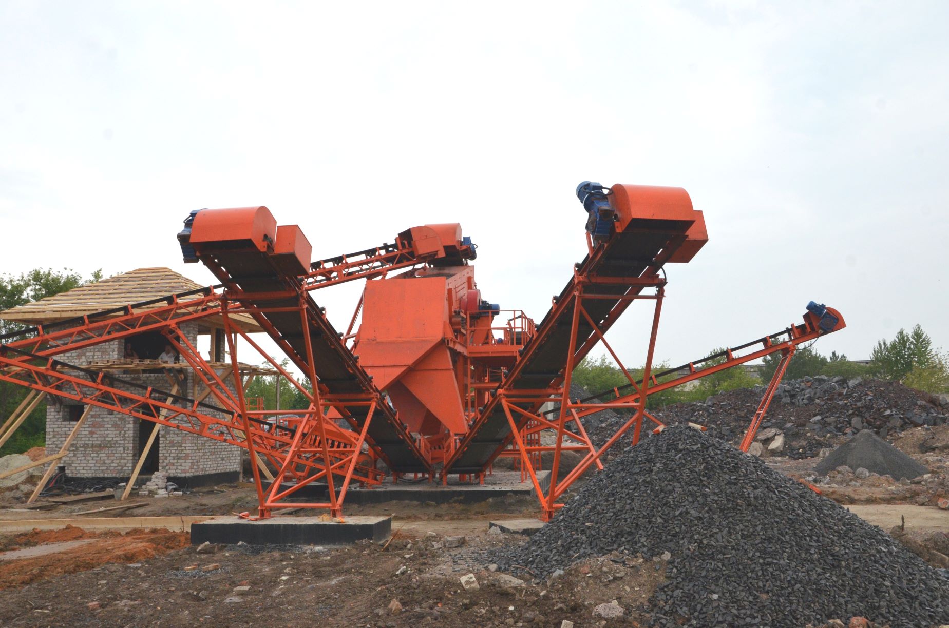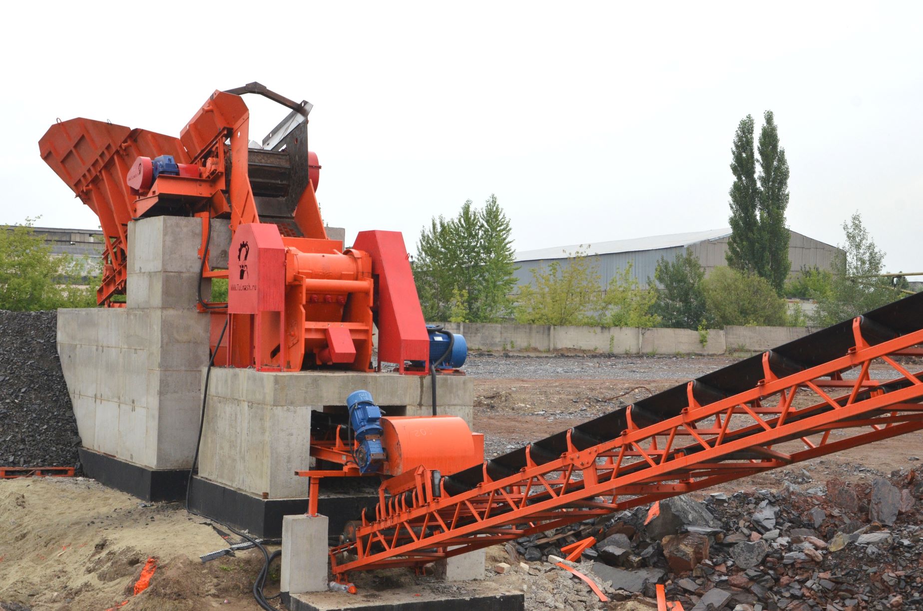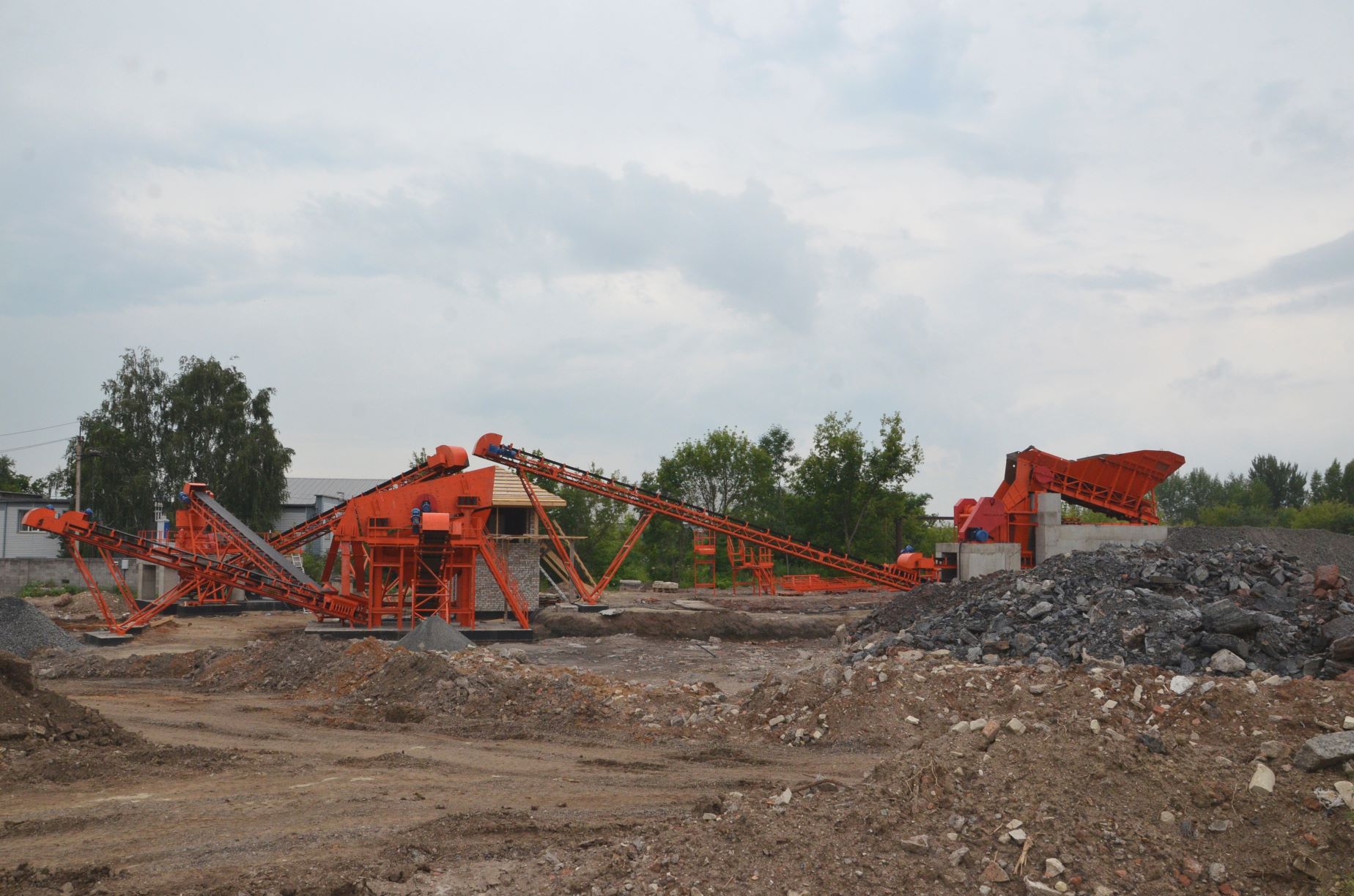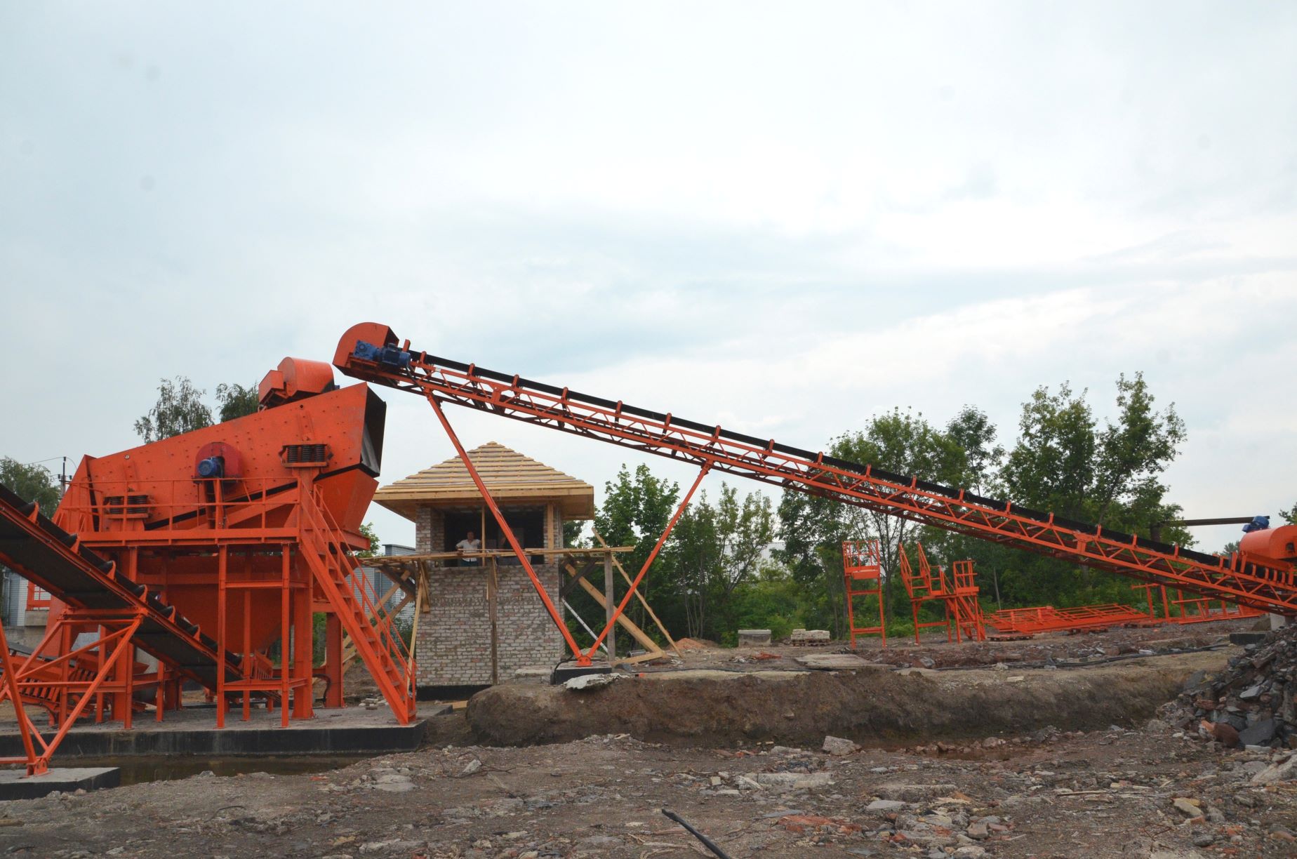 Измельченный материал для товарной классификации подается с помощью двух параллельных ленточных конвейеров на инерционный грохот.