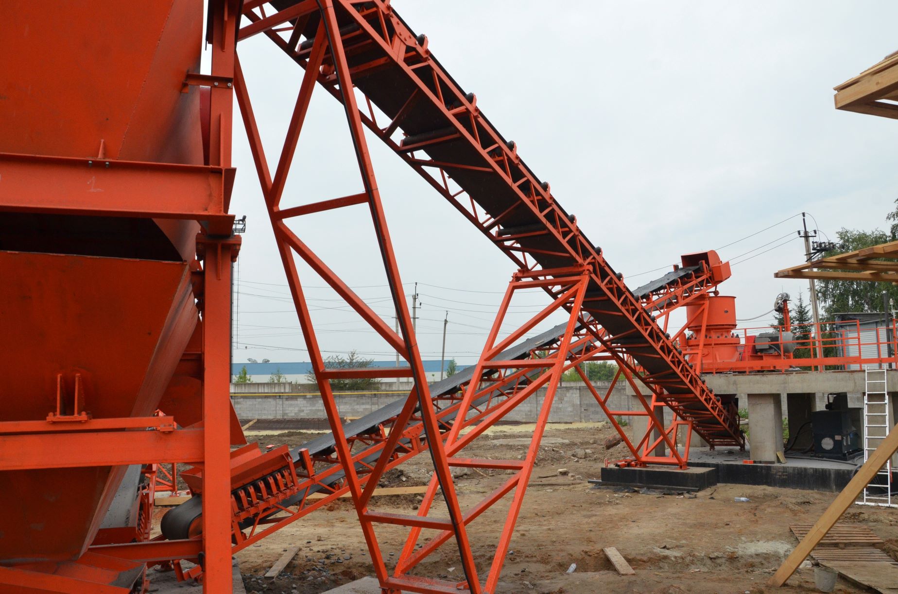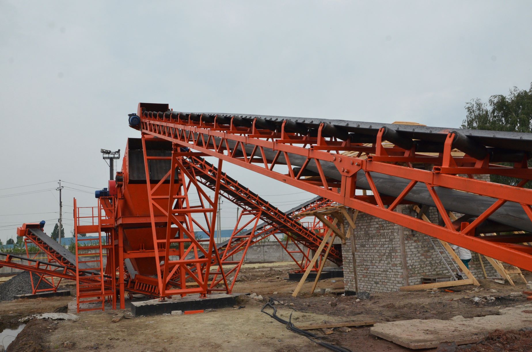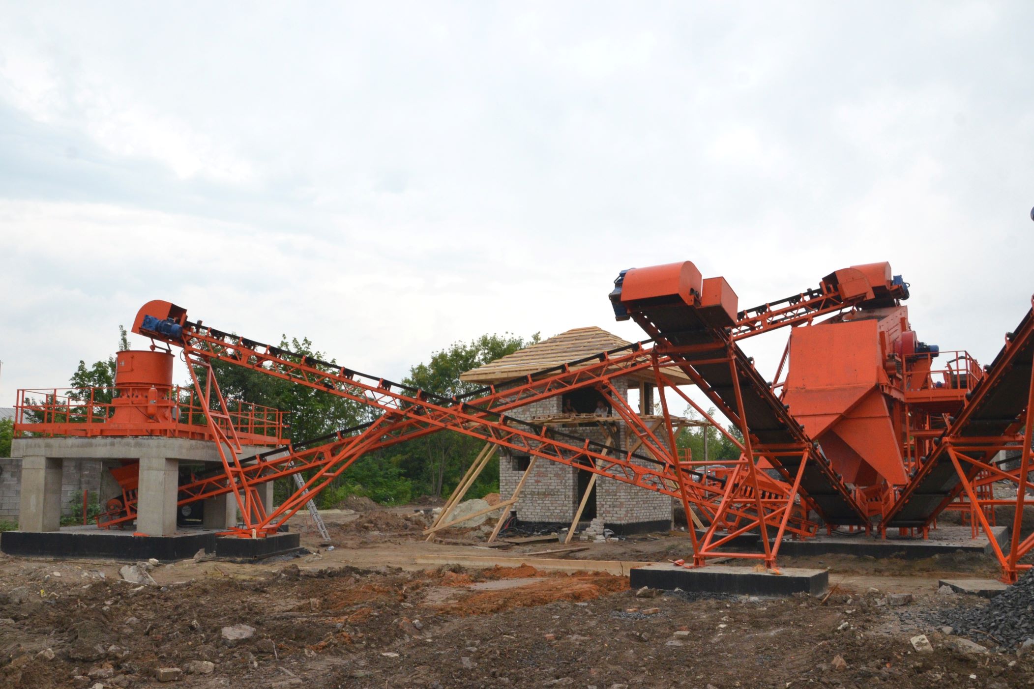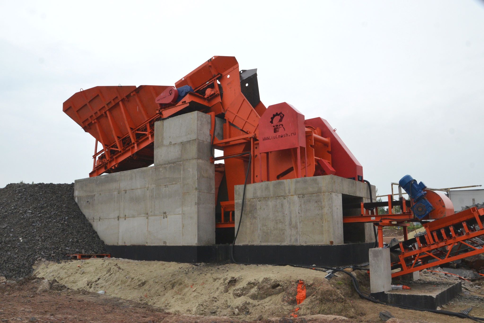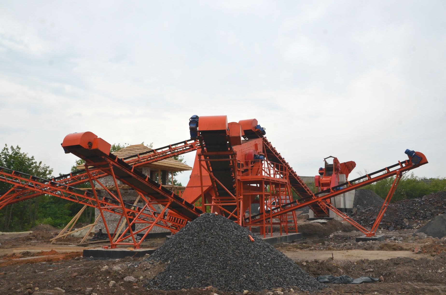 Измельченный материал для товарной классификации подается с помощью двух параллельных ленточных конвейеров на инерционный грохот.