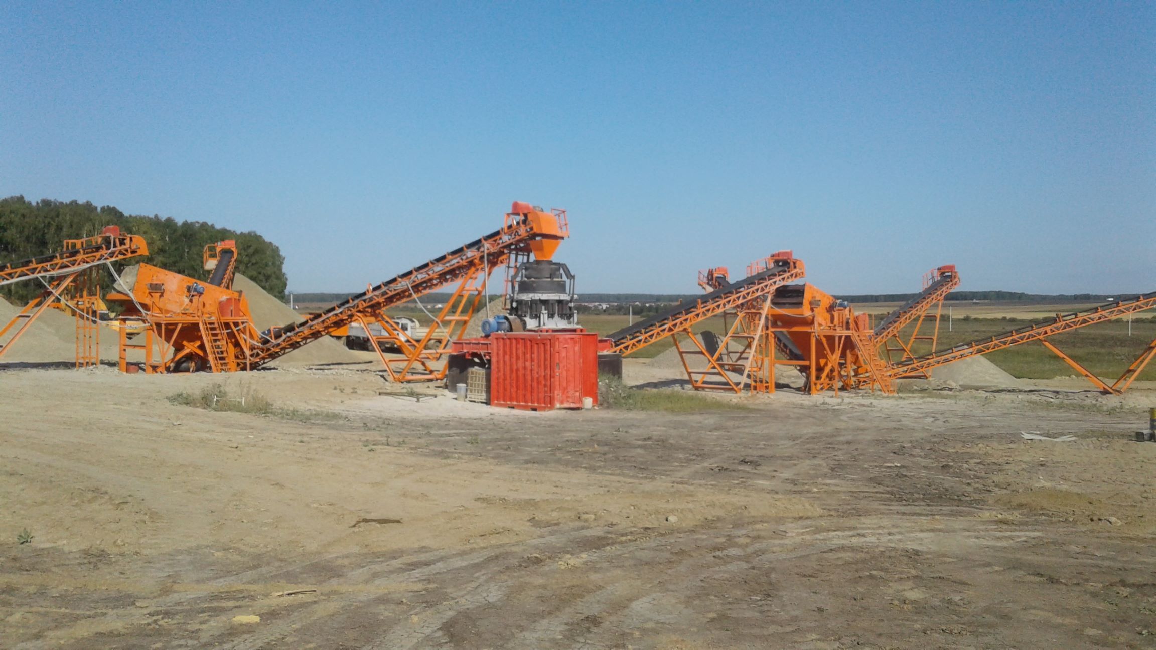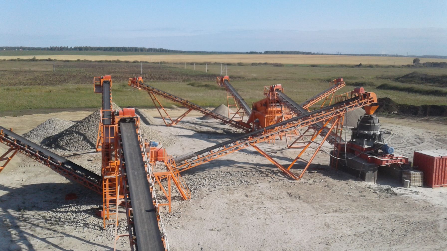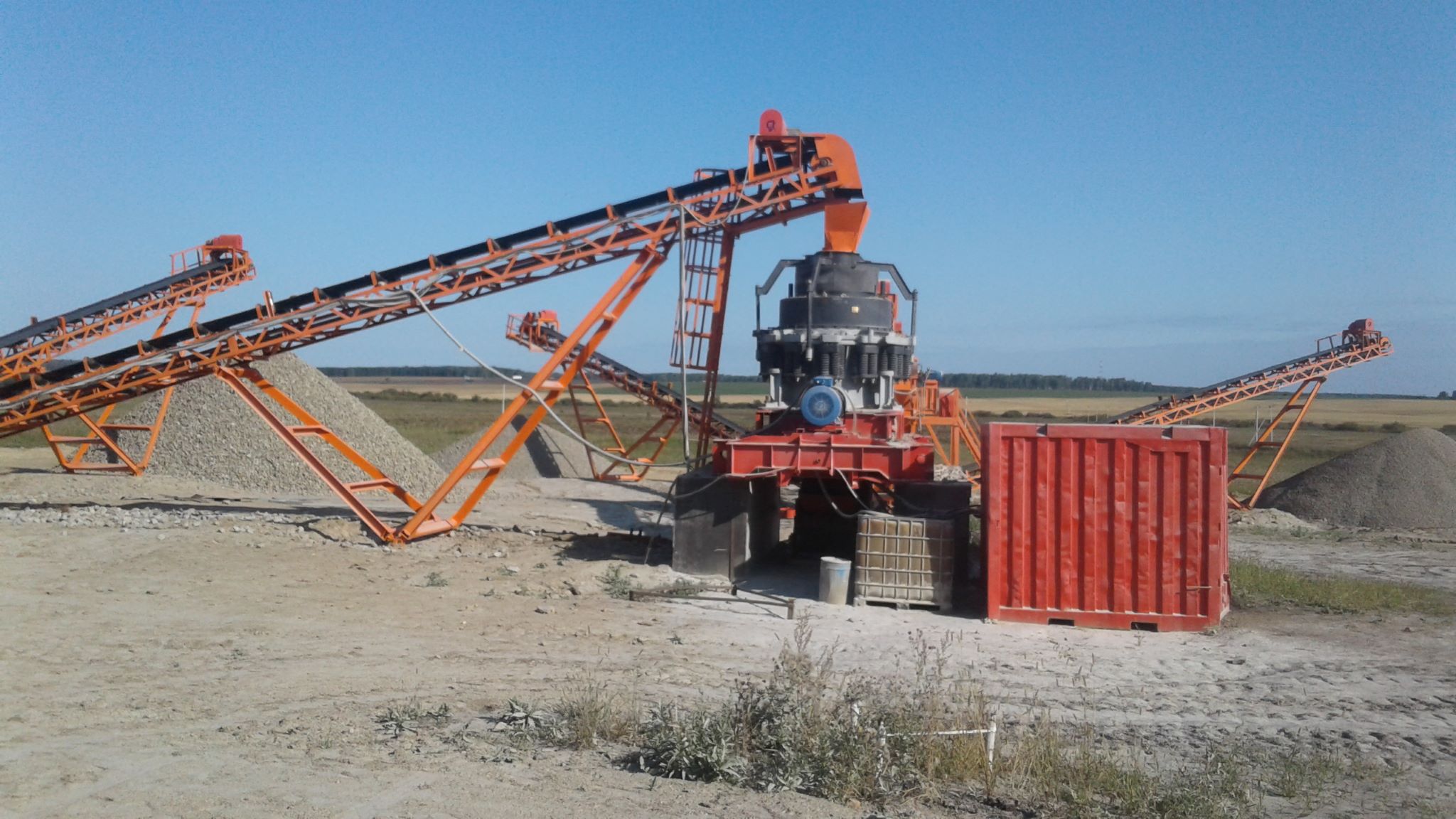 Из приемного бункера пластинчатый питатель осуществляет равномерную подачу твердых пород в щековую дробилку первой стадии СДС6/9. Там происходит первичное разрушение материала, и перемещение его на ленточный конвейер. Вторая стадия дробления осуществляется в конусной дробилке КД-1200, откуда материал по ленточному конвейеру поступает на товарную сортировку в инерционном грохоте ГИС-53. Продукция и отсев дробления отгружаются в конуса при помощи конвейеров (ширина ленты 800 мм, длина 20м, угол установки до 17 градусов).
