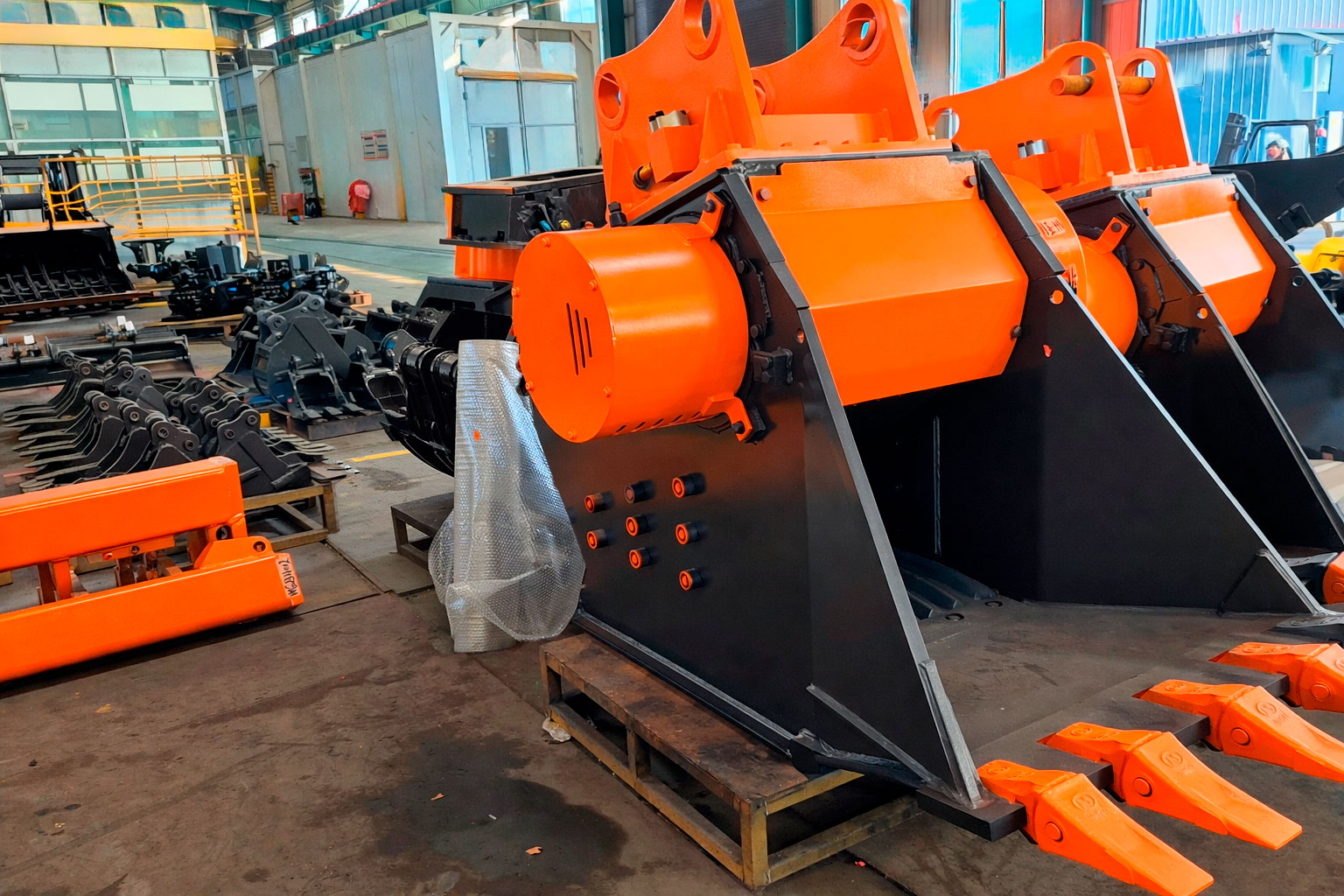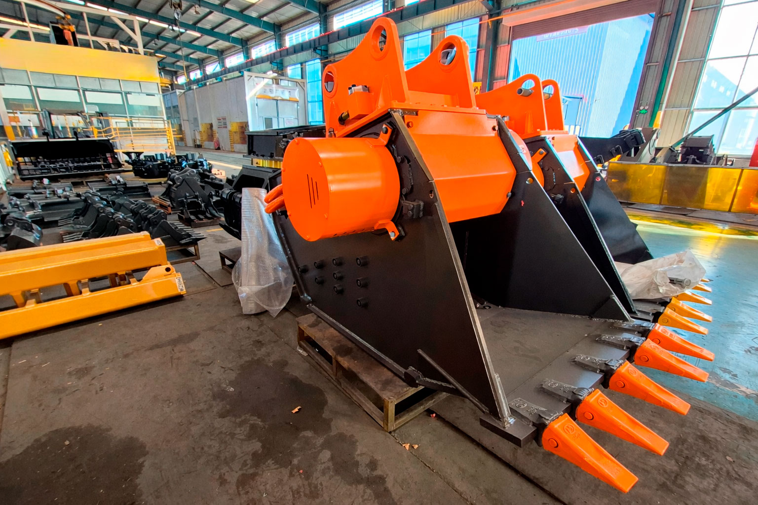 Основные элементы ковша изготовлены из высокопрочных и износостойких стальных плит, рассчитанных на работу с твердыми породами и строительными отходами.