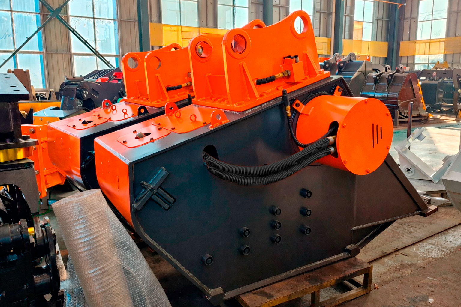 Ковш эффективно применяется при демонтаже зданий, переработке строительного мусора, в дорожном строительстве и при разработке карьеров. Полученный после дробления материал может использоваться повторно — для подсыпки оснований, подготовки дорожных покрытий или производства вторичного щебня.