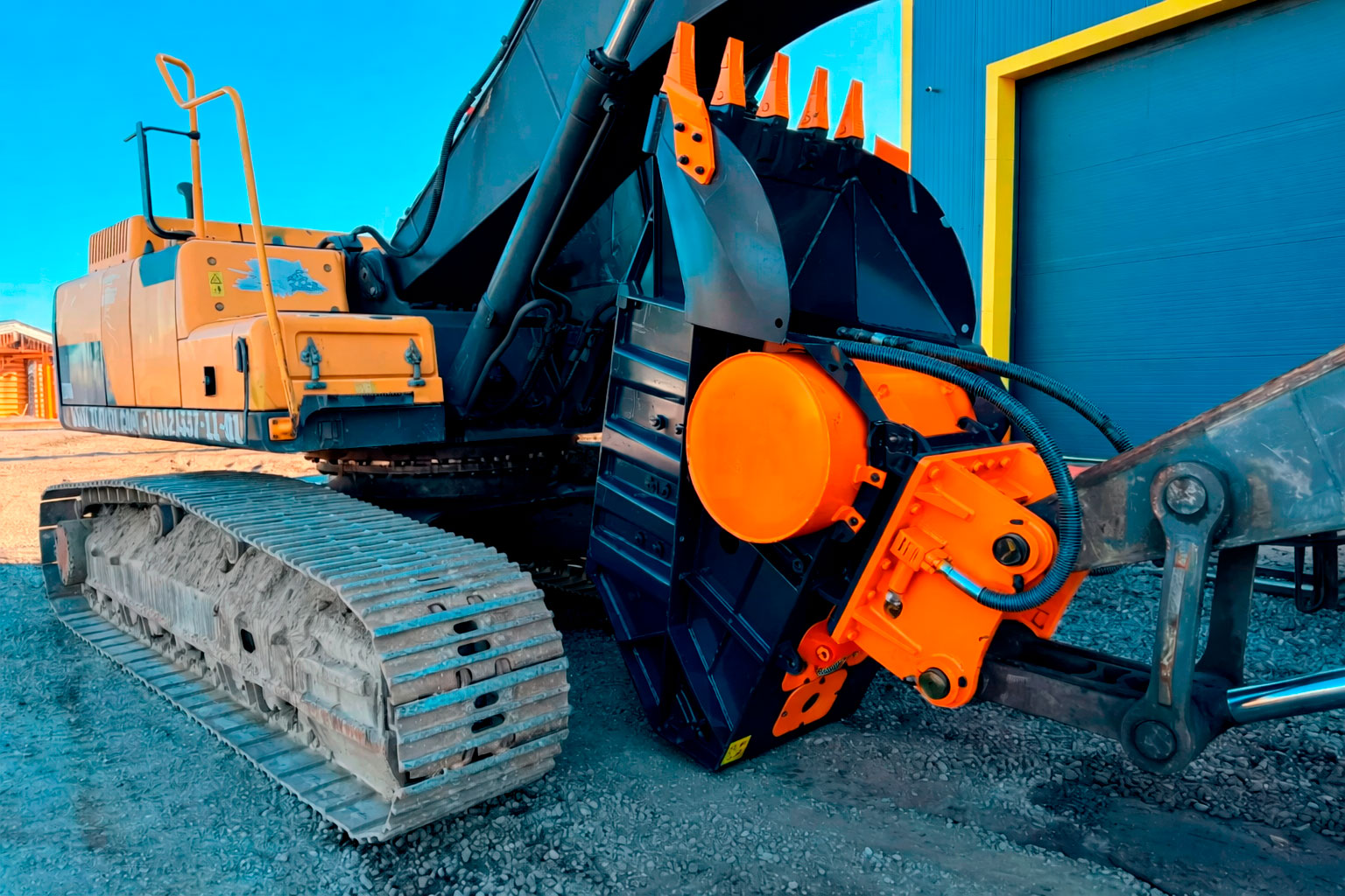 Дробильный ковш устанавливается на стандартный экскаватор и легко перемещается вместе с техникой между объектами.