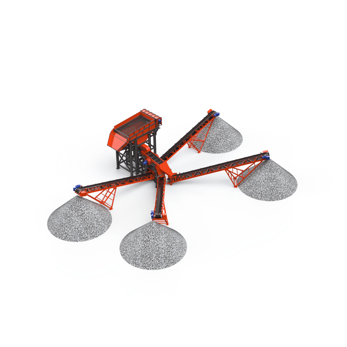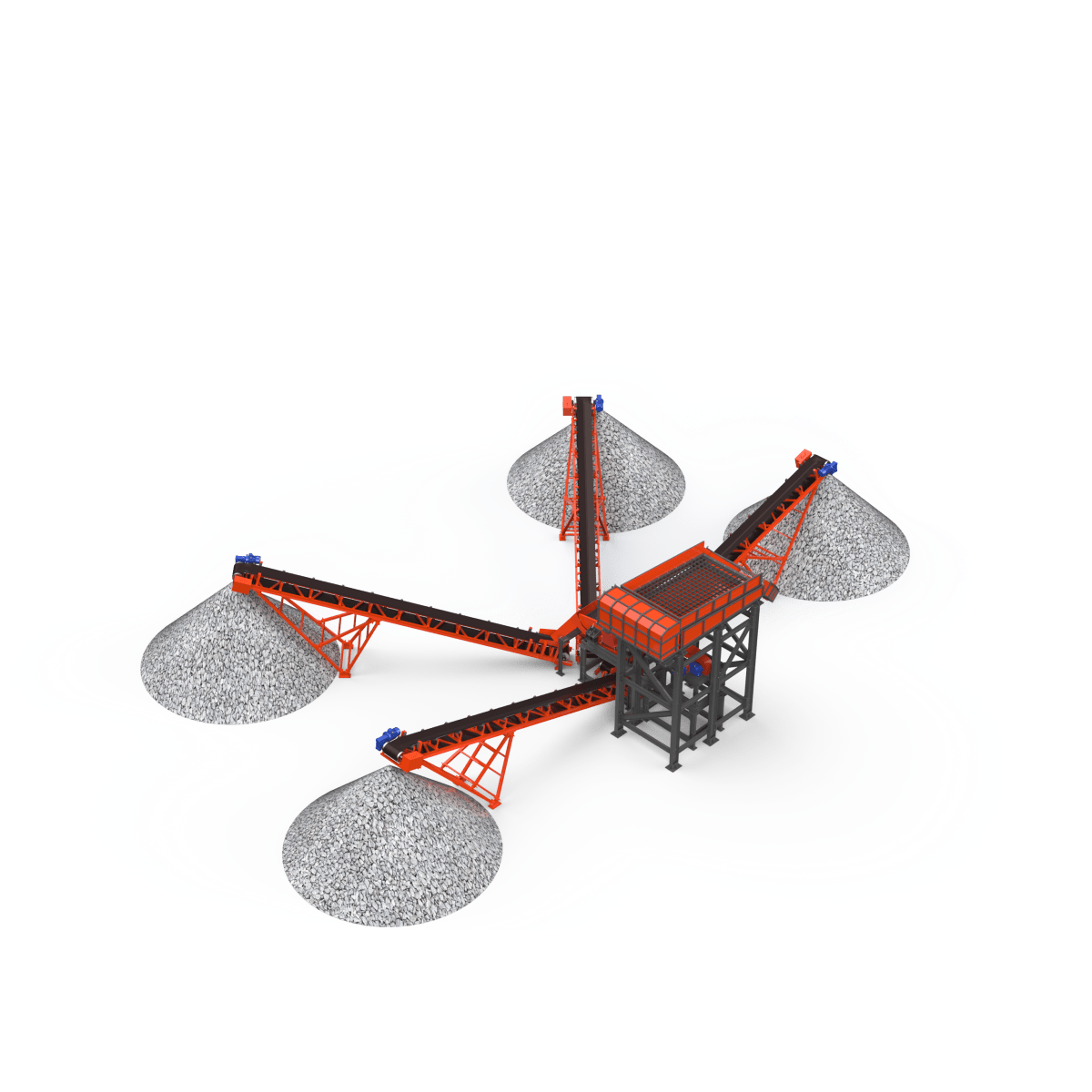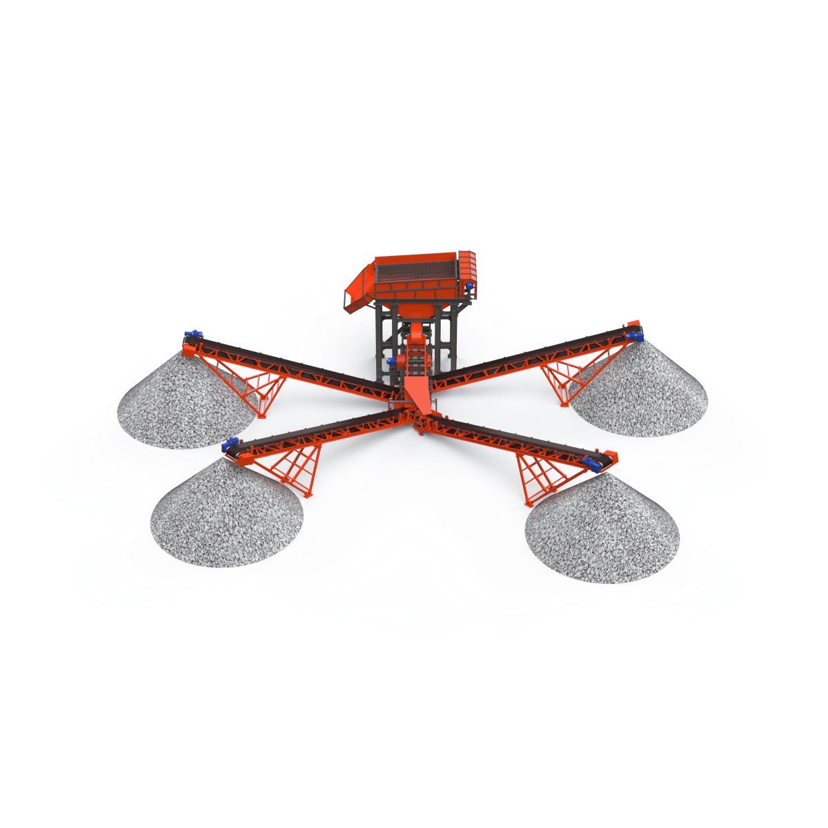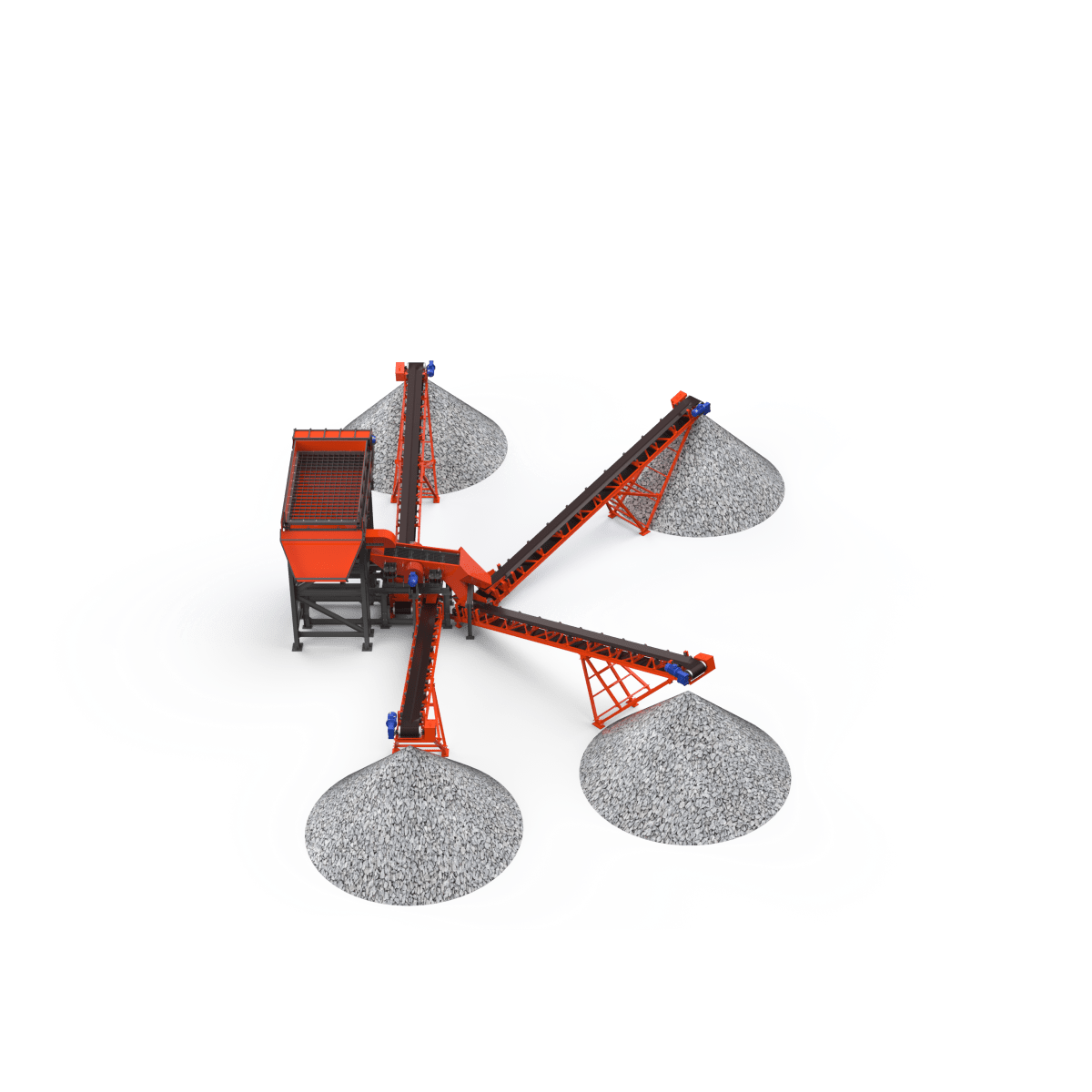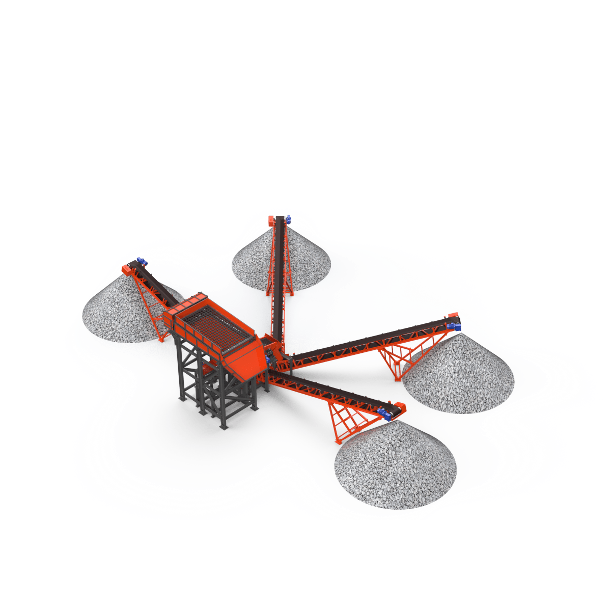 Материал, прошедший через отверстия первого сита, аналогичным образом рассеивается на следующем сите на два класса по крупности. Самый крупный материал попадает в приемную емкость (течку), расположенную под выгрузным отверстием грохота. Выгрузка материала с сит осуществляется воронками. Форма и размер приемного бункера зависит от условий эксплуатации, физико-механических свойств загружаемого материала и желания Заказчика.