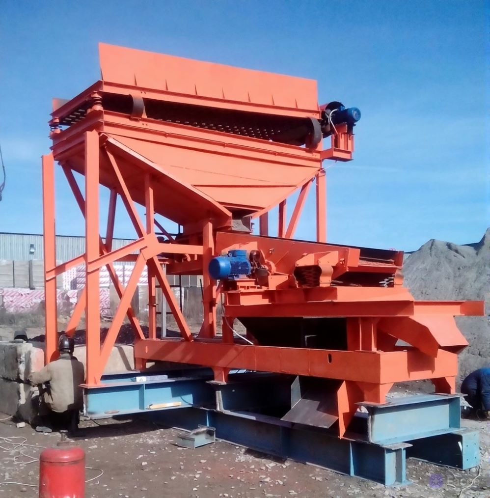 Материал из бункера равномерно подается для дальнейшей сортировки на инерционном грохоте с помощью лоткового питателя (поз.3), представляющего собой подвижной лоток с приводом и кривошипно-шатунным механизмом. Материал попадает на подвижную тележку, совершающую возвратно-поступательные движения и за счет ее колебания, движется в зону выгрузки на инерционный грохот (поз.4). Питатель крепится на общую раму (поз.5), на которой устанавливается бункер и грохот.