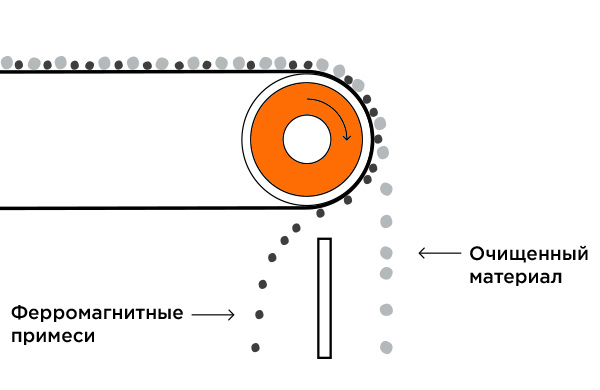 Перемещаемый продукт, на транспортерной ленте попадает в зону действия поля сепаратора, где металлические составляющие удерживаются через транспортерную ленту и вместе с ней продолжают свое движение. В зоне схода материала, немагнитные компоненты продолжают свое движение, а магнитные затягиваются под транспортер и в месте отсоединения ленты от магнитного барабана отсоединяются и под собственным весом ссыпаются в приемный бункер, либо отводящий конвейер.