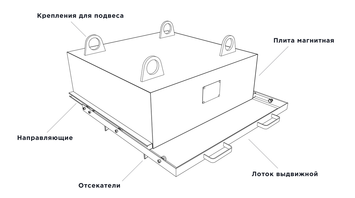 Магнитная механическая плита работает следующим образом: материал, перемещаемый конвейером, проходя под сепаратором, попадет в зону действия его магнитного поля.
