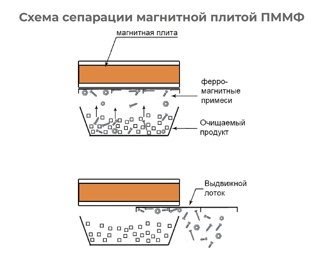 Плита магнитная механическая МПМФ служит для удаления металлических частиц различных фракций из сухих сыпучих продуктов (содержание влаги до 5%).