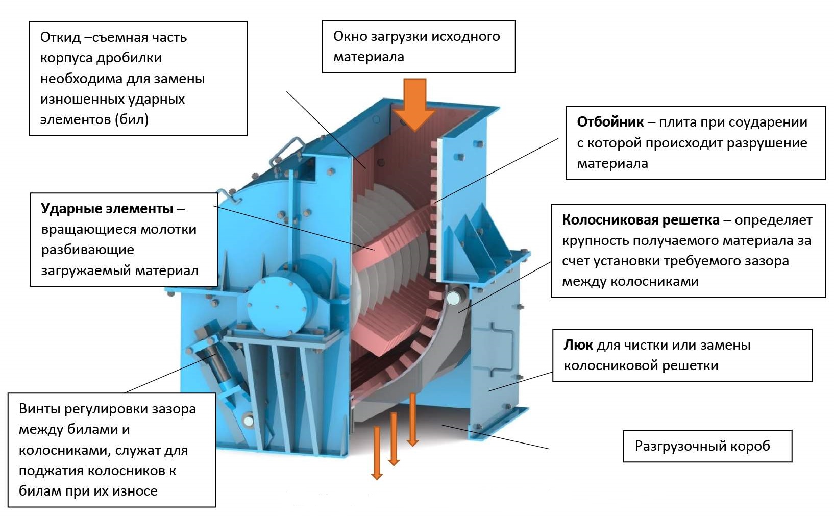 Дробилка МПС-950 – высокопроизводительная молотковая дробилка. Предназначена для измельчения минерального и техногенного сырья температурой плавления не менее 150°С. Влажность сырья не должна препятствовать свободному проскакиванию раздробленного материала через зазоры колосников.