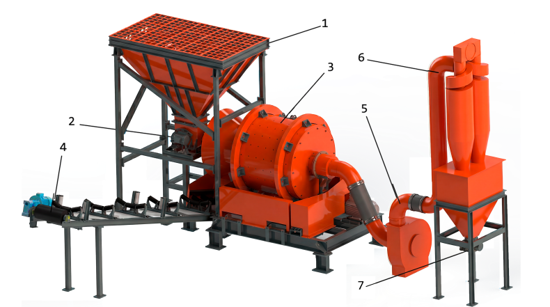 Дробильный комплекс на базе шаровой мельницы включает: загрузочный бункер (поз. 1); вибрационный питатель (поз. 2); шаровую мельницу (поз. 3); ленточный конвейер (поз. 4); вентилятор (поз. 5); циклон-бункер (поз. 6); секторный питатель (поз. 7).