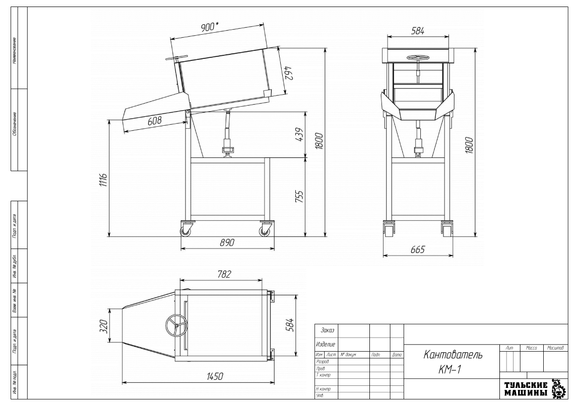 Кантователь включает в себя: раму, установленную на прорезиненных колесиках, для удобного перемещения кантователя по производственной площадке; откид с направляющим лотком, обеспечивающий разгрузку кантователя; гидравлический домкрат, предназначенный для подъема откида и (в случае комплектации) разгрузочную тару с винтовой заслонкой для дозировки подачи материала.